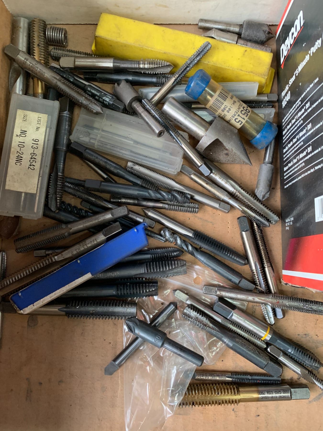 BOX OF MACHINIST TOOLS-ASSORTED TAPS, CUTTERS & DRILLS