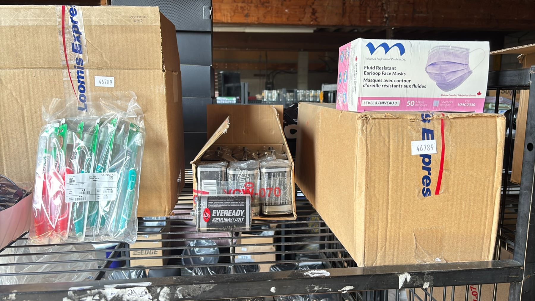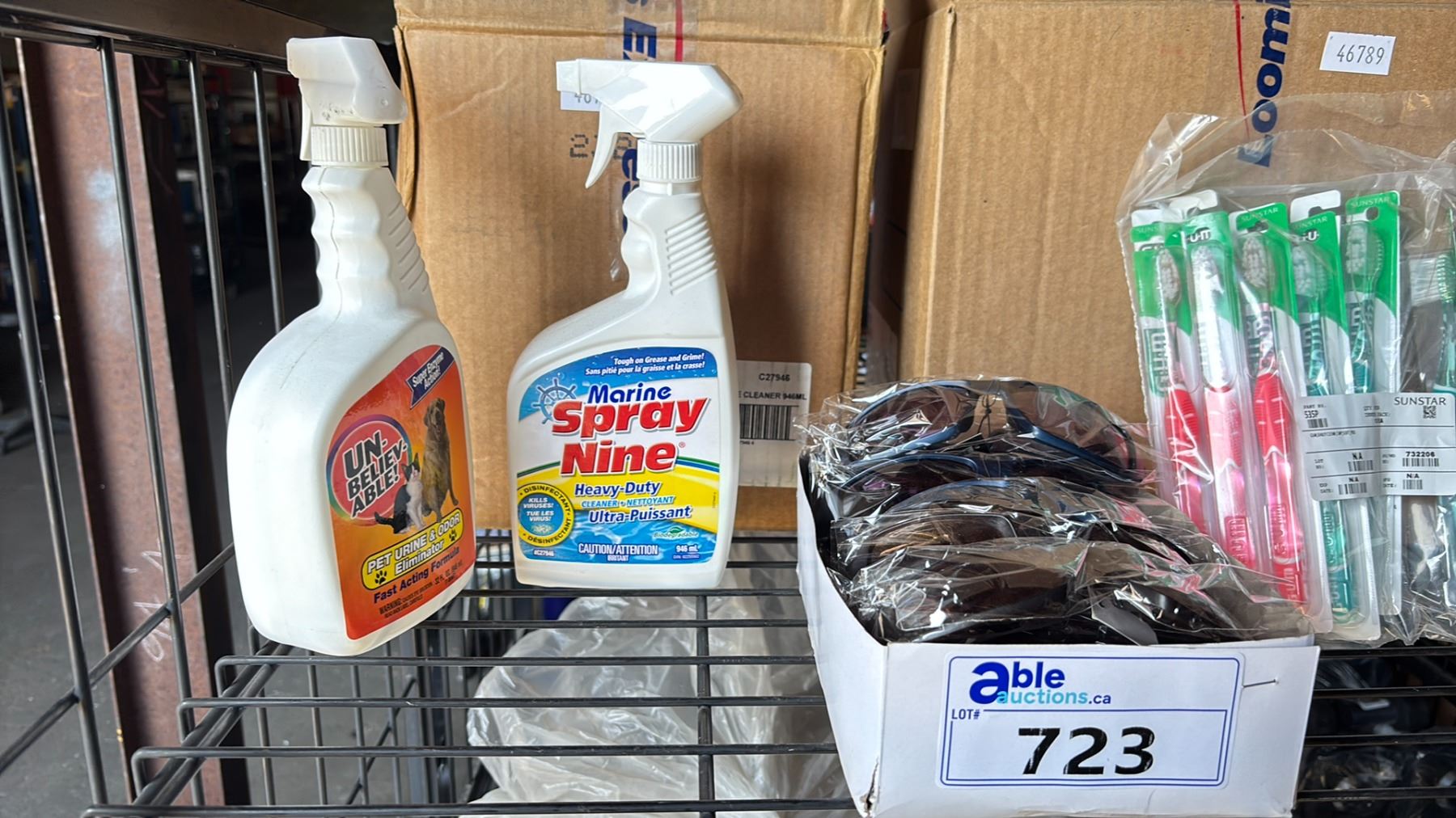 BOX OF MARINE SPRAY NINE, BOX OF SUNGLASSES, BOX OF GUM TOOTHBRUSHES, BOX OF EVER READY SUPER HEAVY DUTY CARBON ZINC BATTERIES & FLUID RESISTANT EARLOOP FACE MASKS