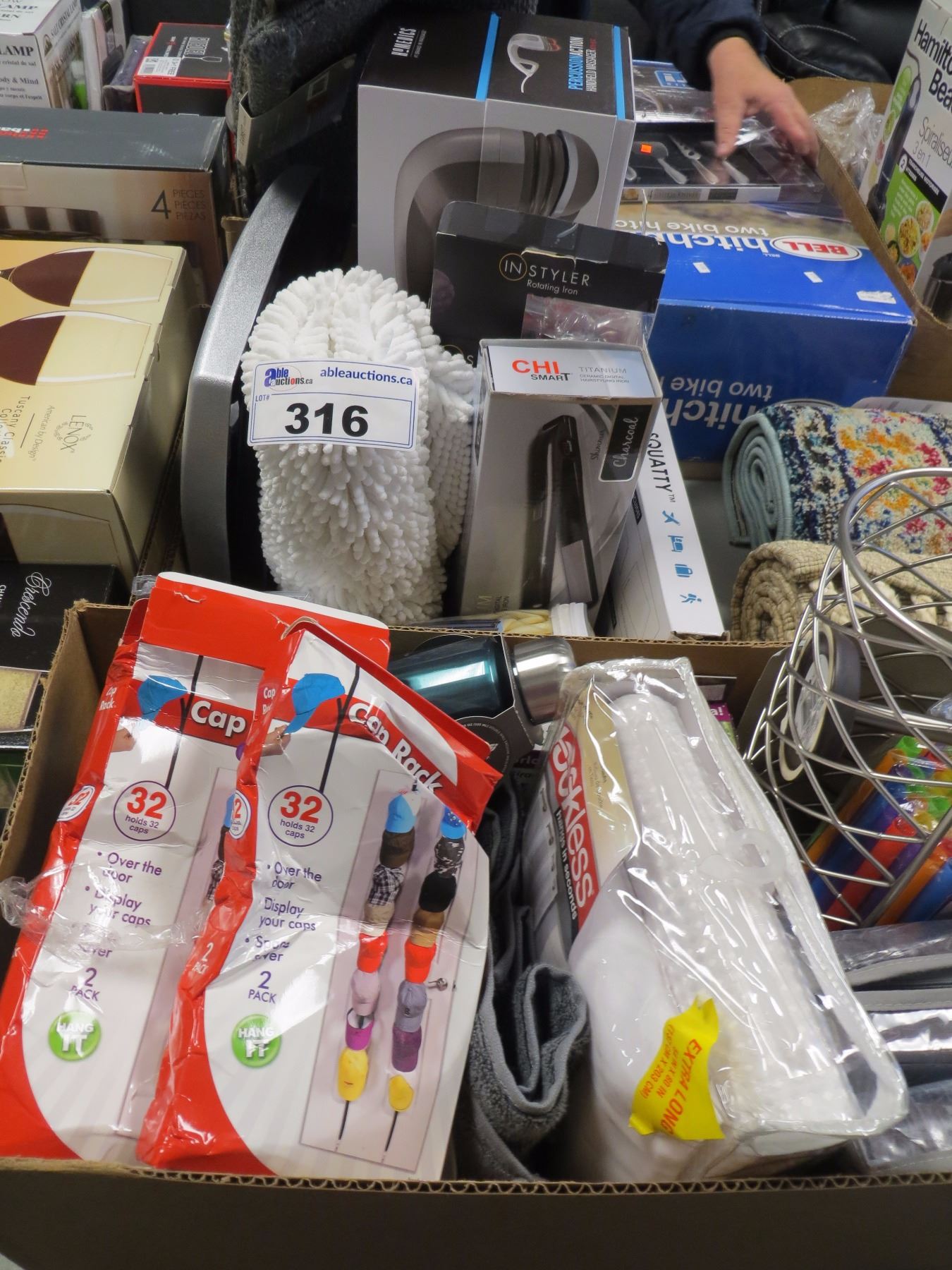 BOX OF MISC HOOKLESS CURTAINS/PILLOW CASES/BATH RUGS/BATHROOM SCALE/HANDHELD MASSAGER/HAIR STYLING IRON