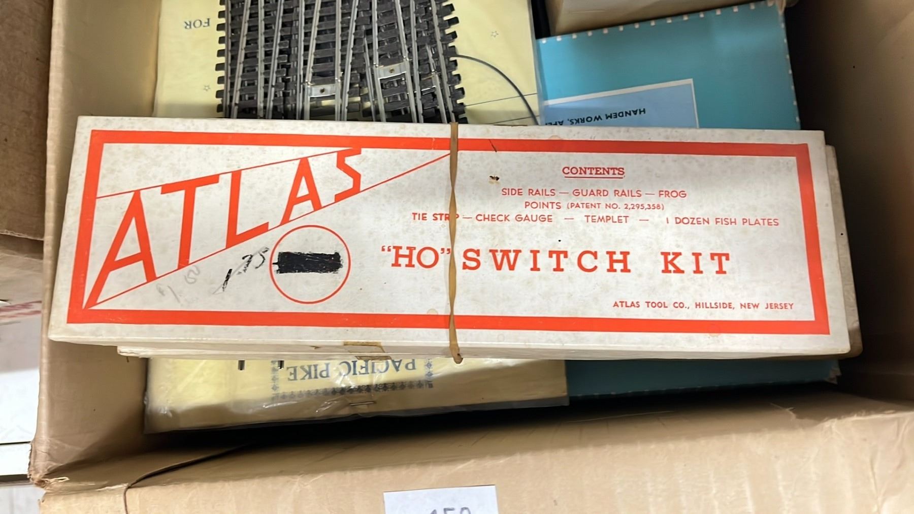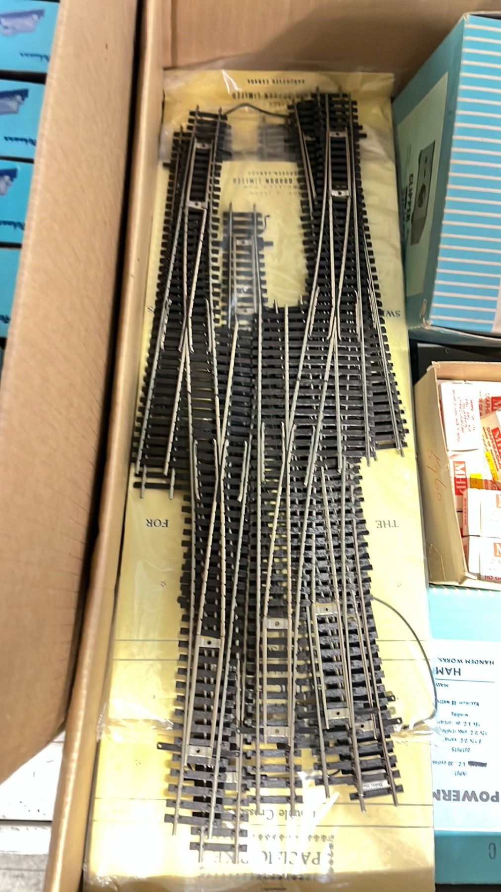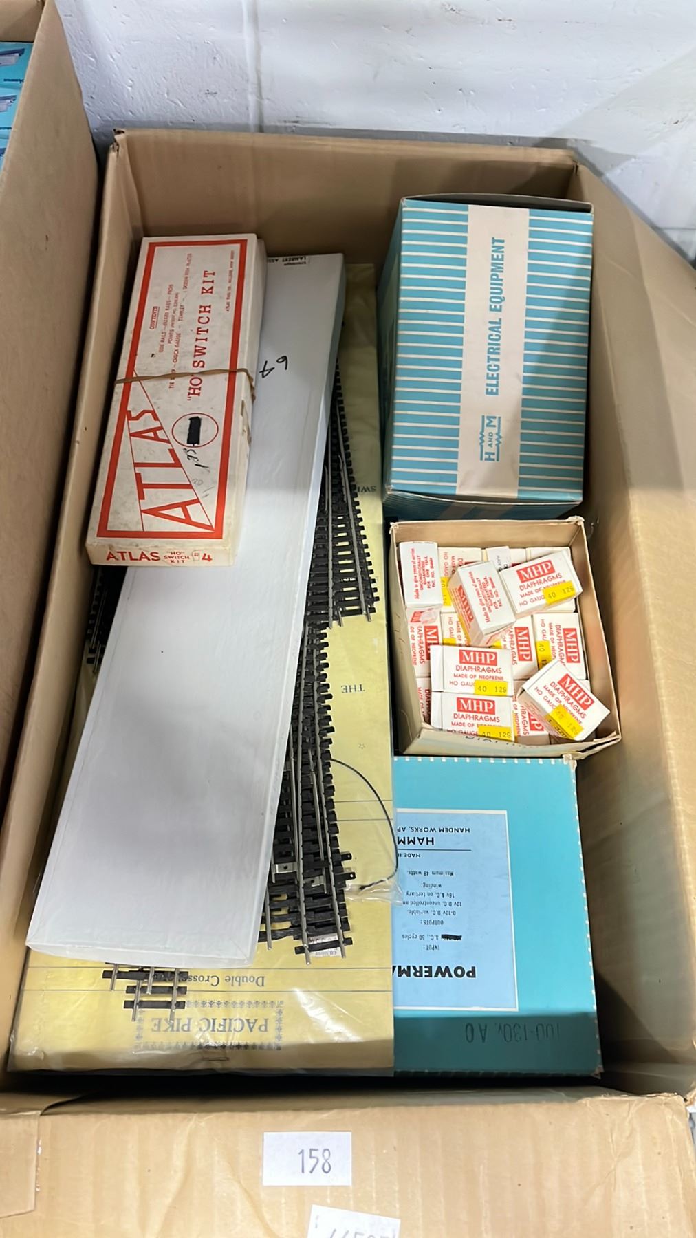 BOX OF MODEL TRAIN ACCESSORIES - TRACKS, VARIABLE TRANSFORMER UNIT, DIAPHRAGMS, POWER CONTROL UNIT