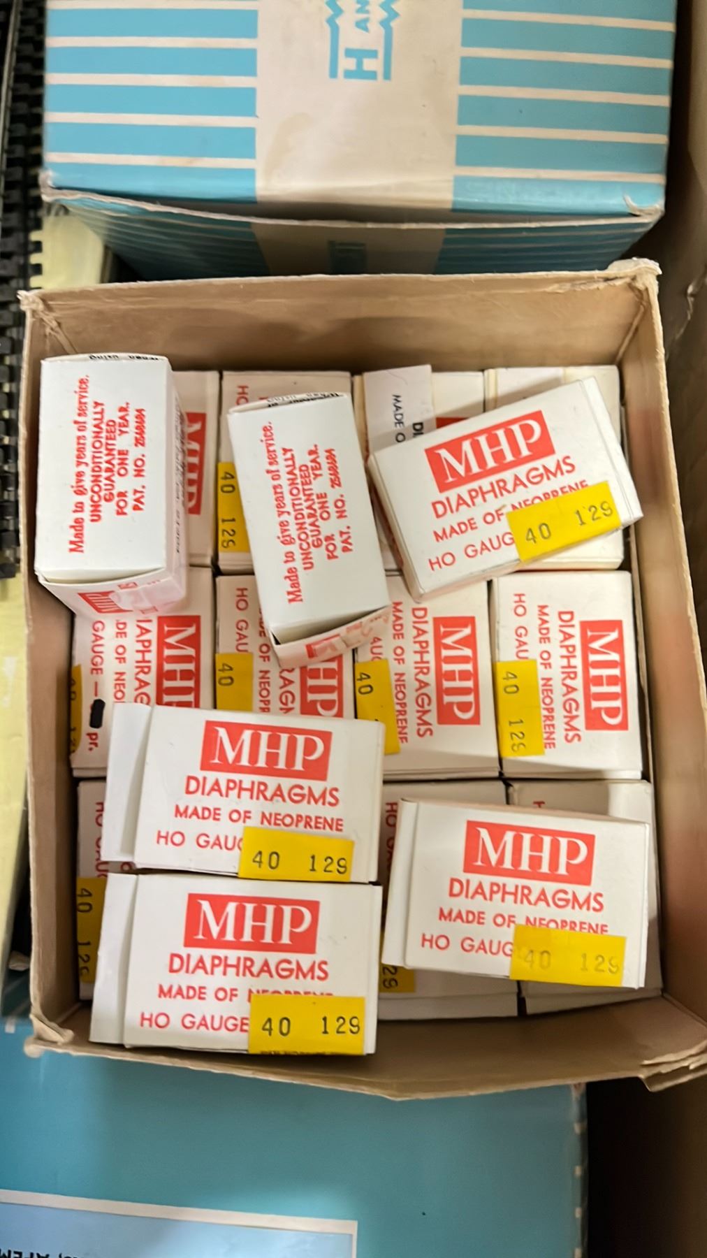 BOX OF MODEL TRAIN ACCESSORIES - TRACKS, VARIABLE TRANSFORMER UNIT, DIAPHRAGMS, POWER CONTROL UNIT & MORE
