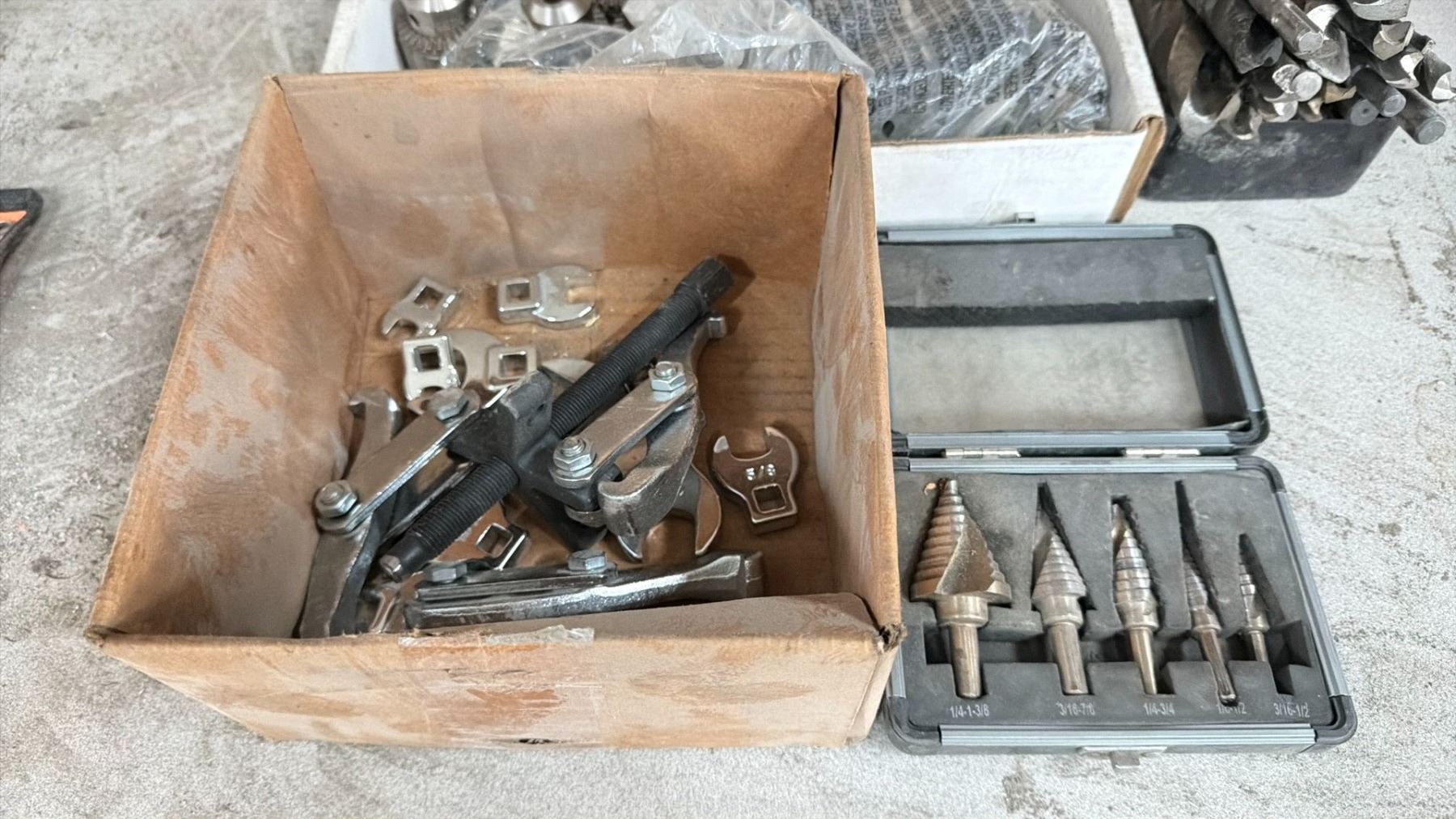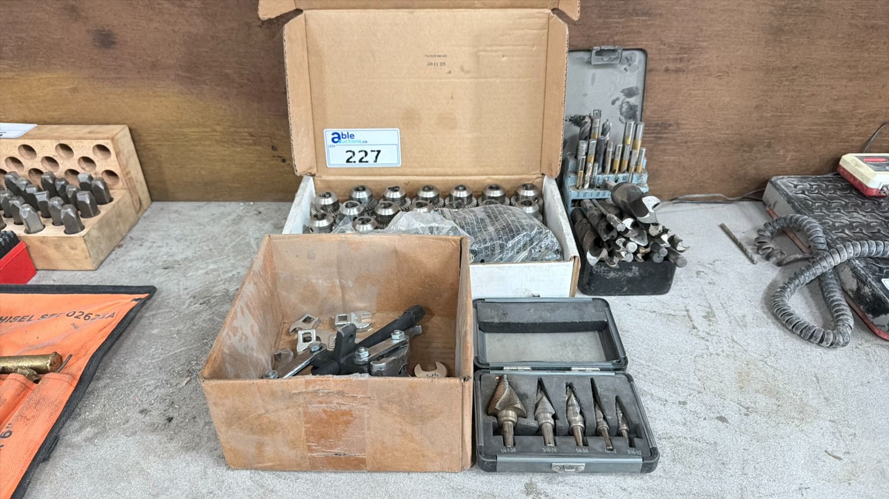 BOX OF NEW DRILL CHUCKS AND ASSORTED DRILL BITS