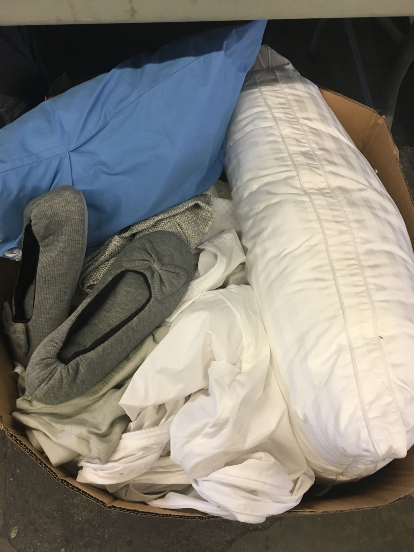 BOX OF PILLOWS, SLIPPERS, CURTAIN PANELS & ASSORTED LINEN