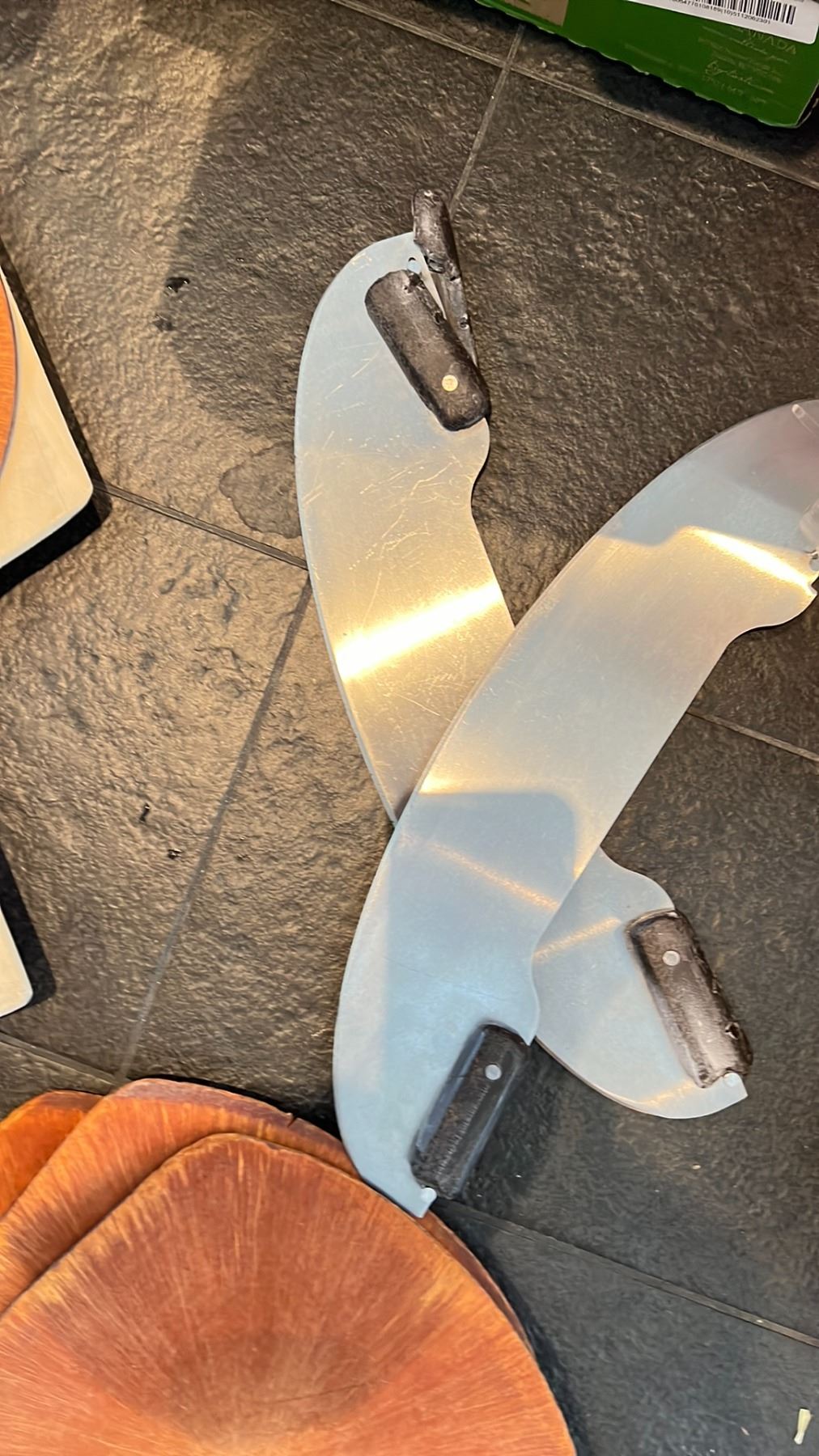 BOX OF PIZZA PANS, BOARDS AND LARGE CUTTING KNIVES. 16X15" PANS, 8X14"