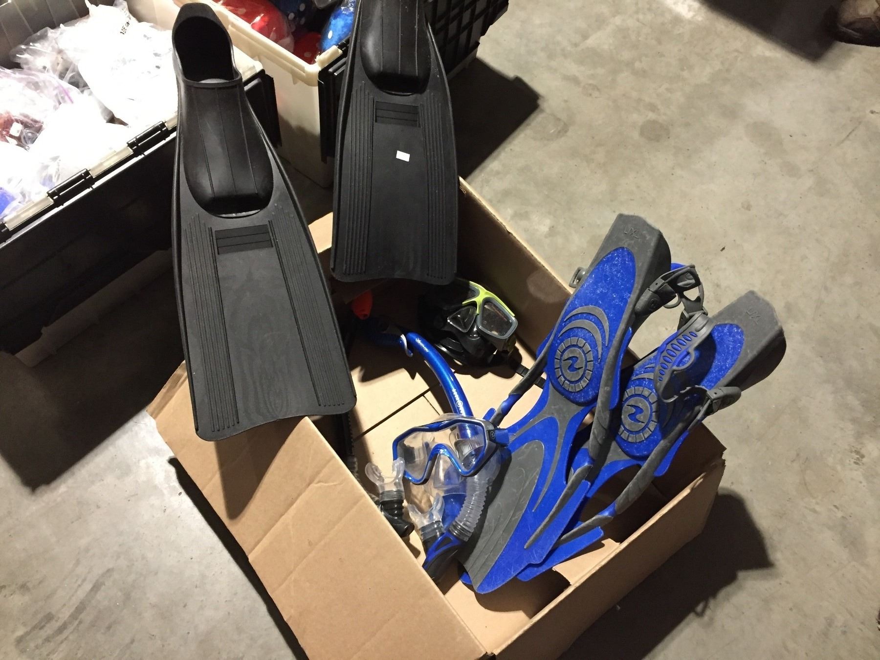 BOX OF SNORKEL GEAR (BLACK FINS MENS 8-10, BLUE FINS L/XL & MASKS)