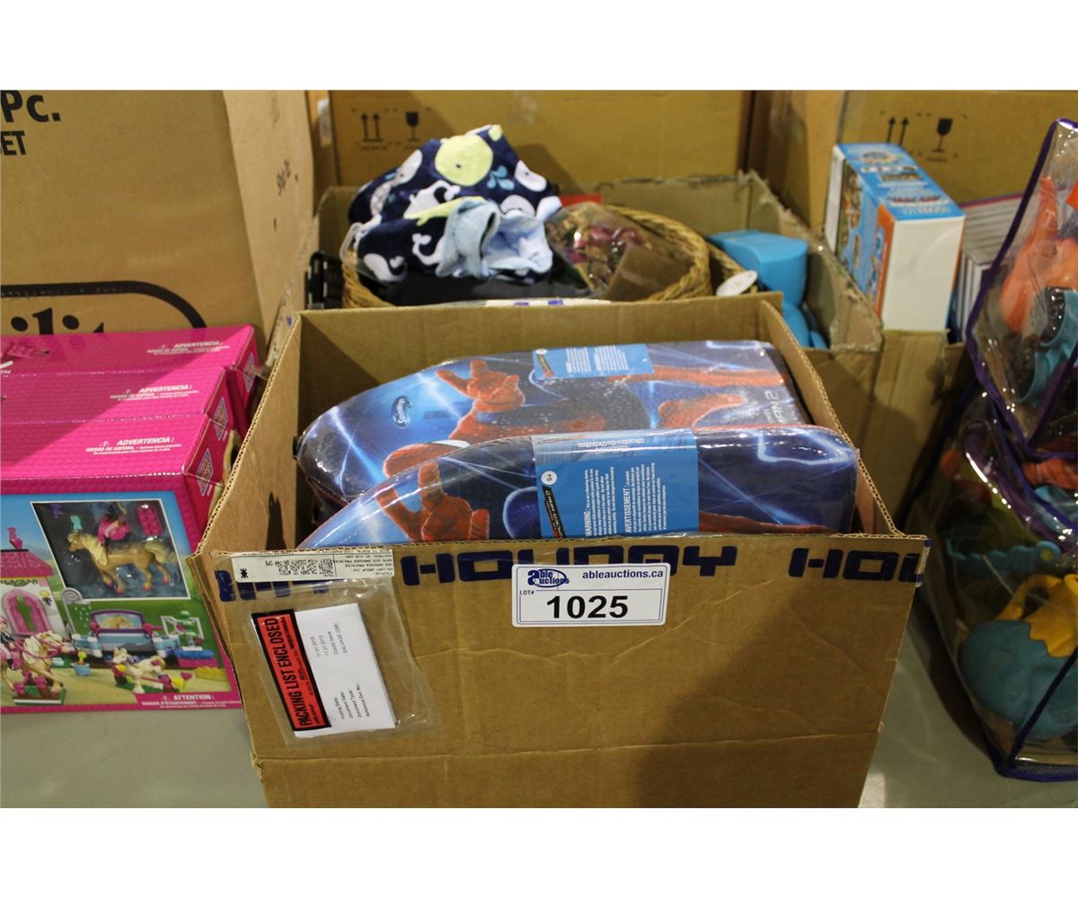 BOX OF SPIDERMAN BOOGIE BOARDS AND MISCELLANEOUS TOYS