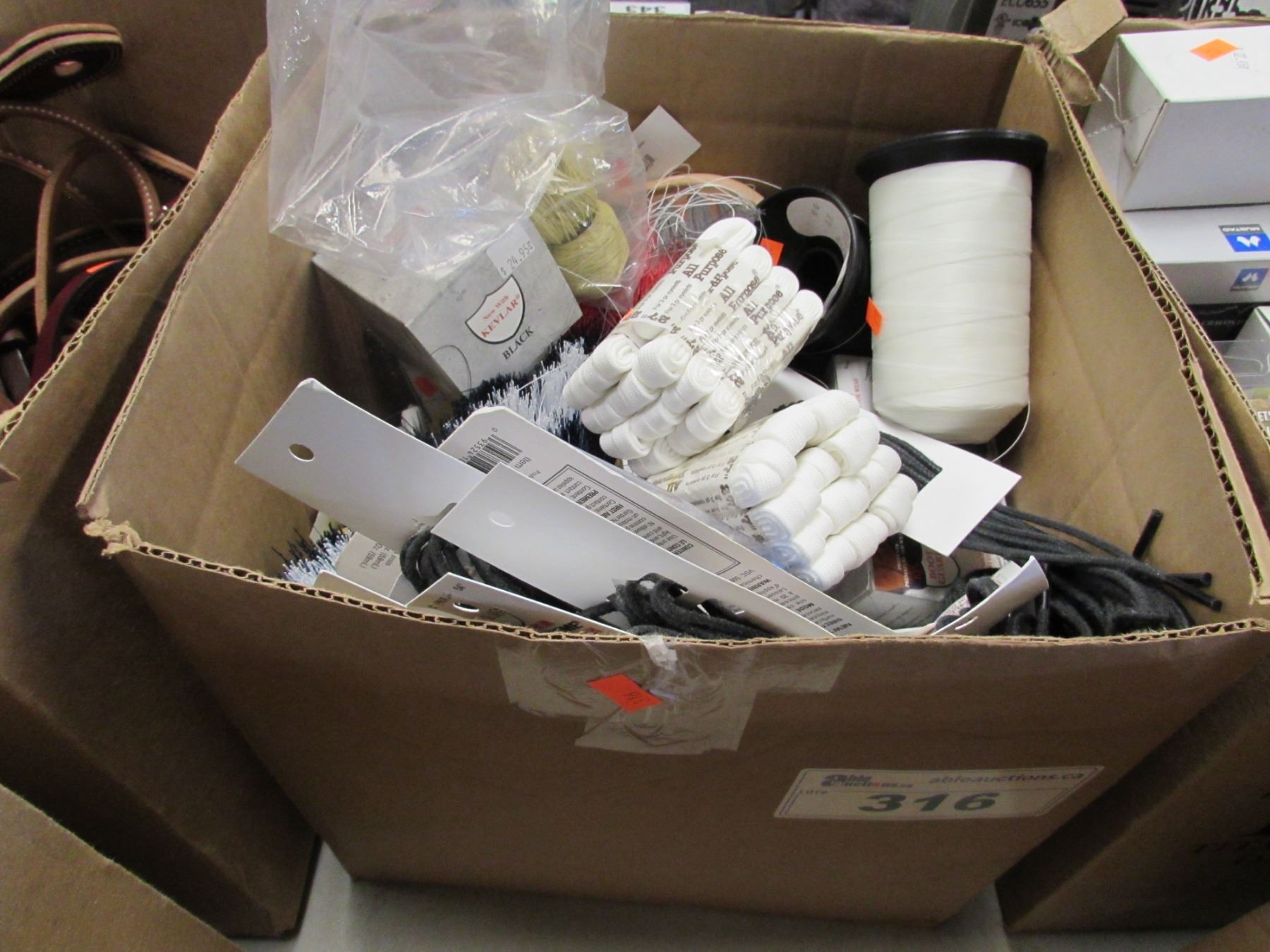 BOX OF THREAD, BRUSHES, SHOE PROTECTION, ASSORTED SHOE PRODUCTS