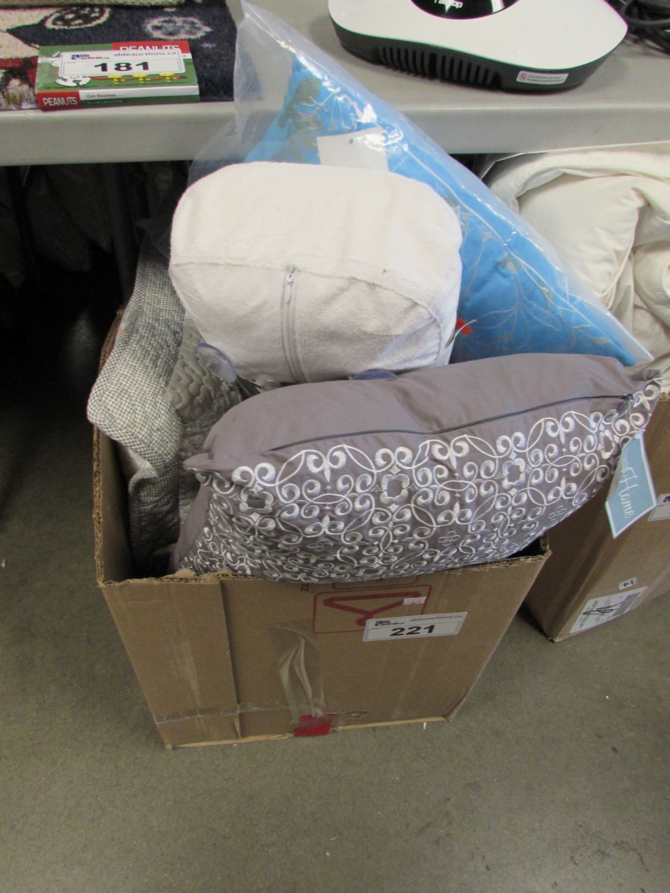 BOX OF THROW PILLOWS, SPA NECK PILLOW, ETC
