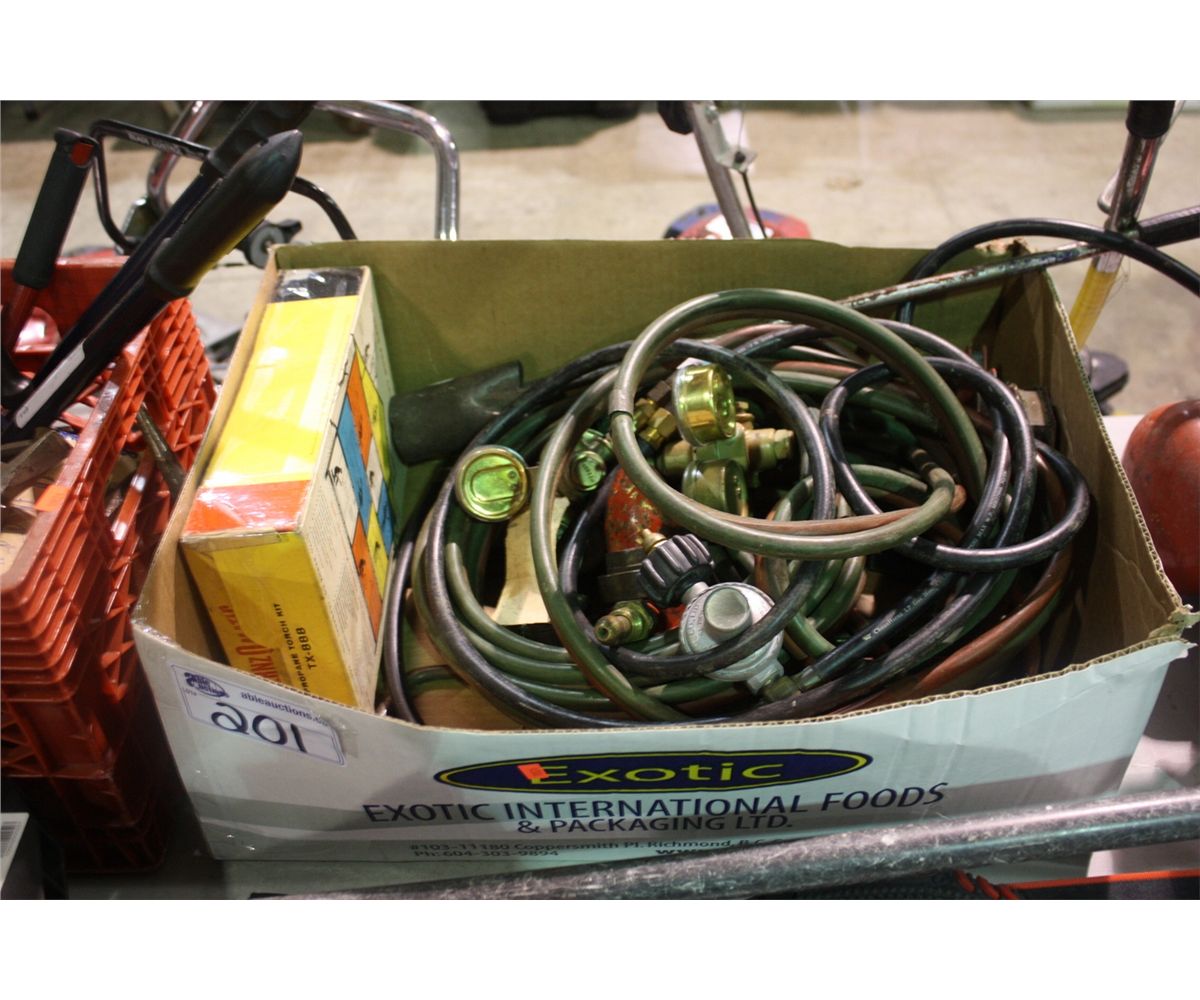 BOX OF TORCH HEADS, HOSES & REGULATORS