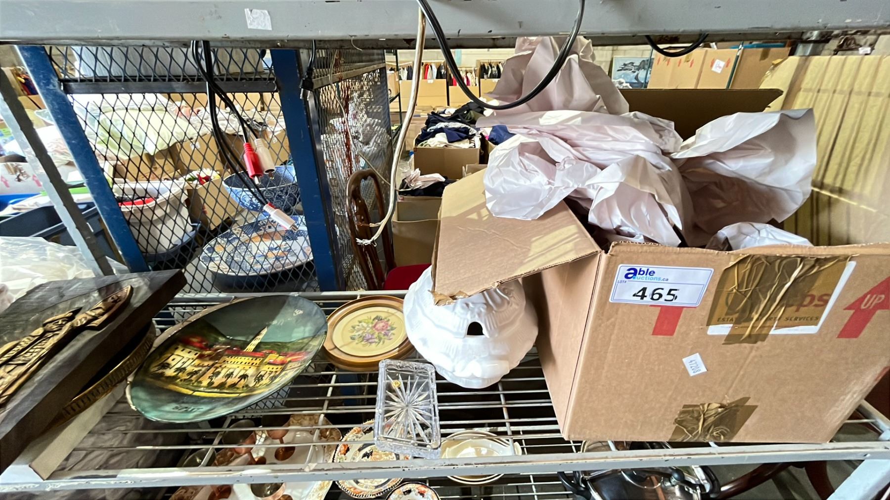 BOX OF VINTAGE GLASSWARE, METAL TRAY DECORATIVE DISHES, ASHTRAY, WALL DECOR & MORE