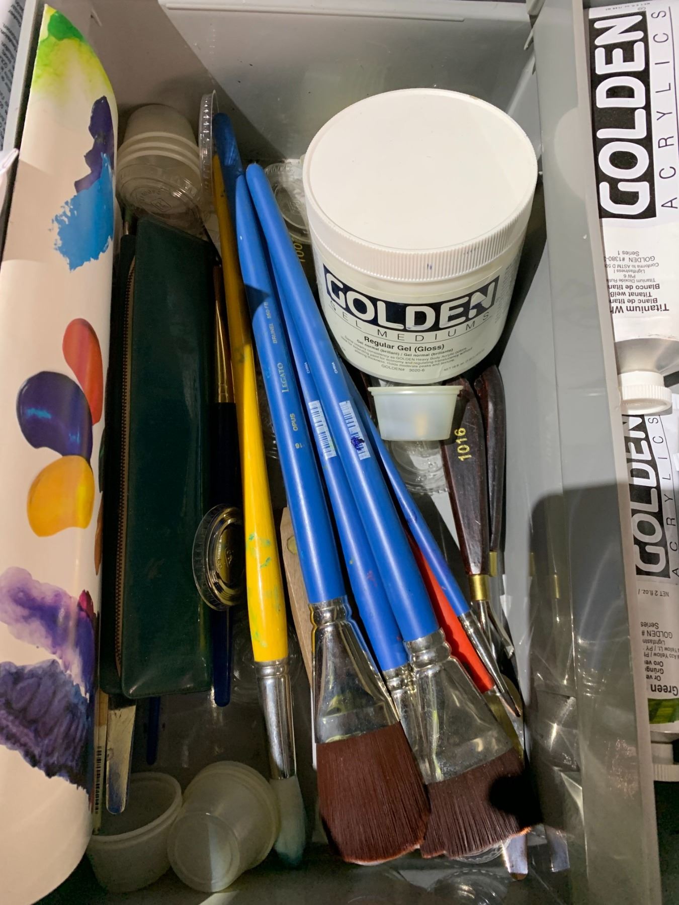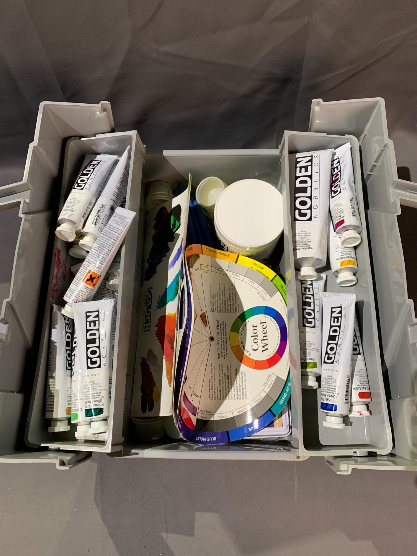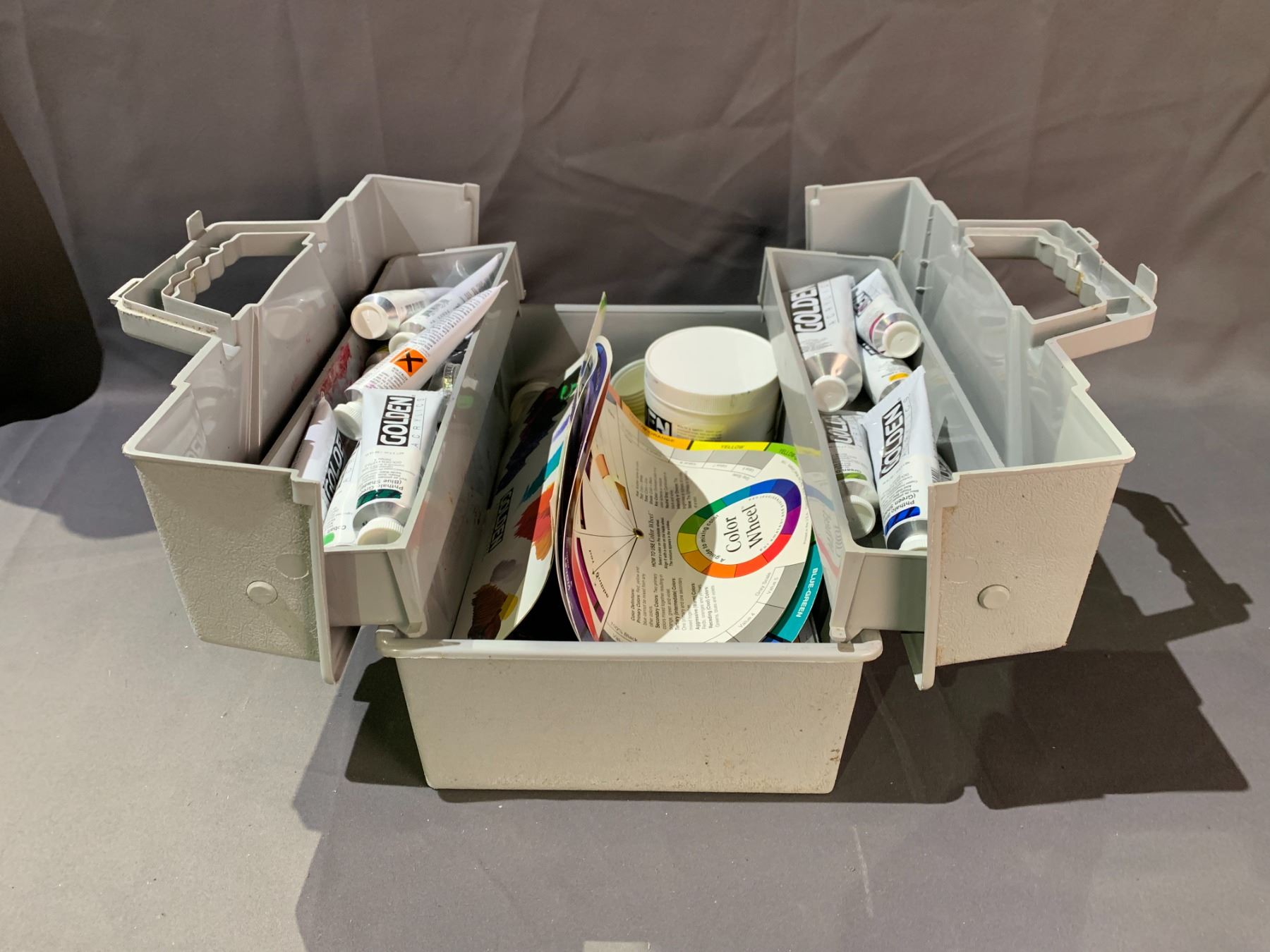 BOX WITH ASSORTED ART SUPPLY CONTENTS