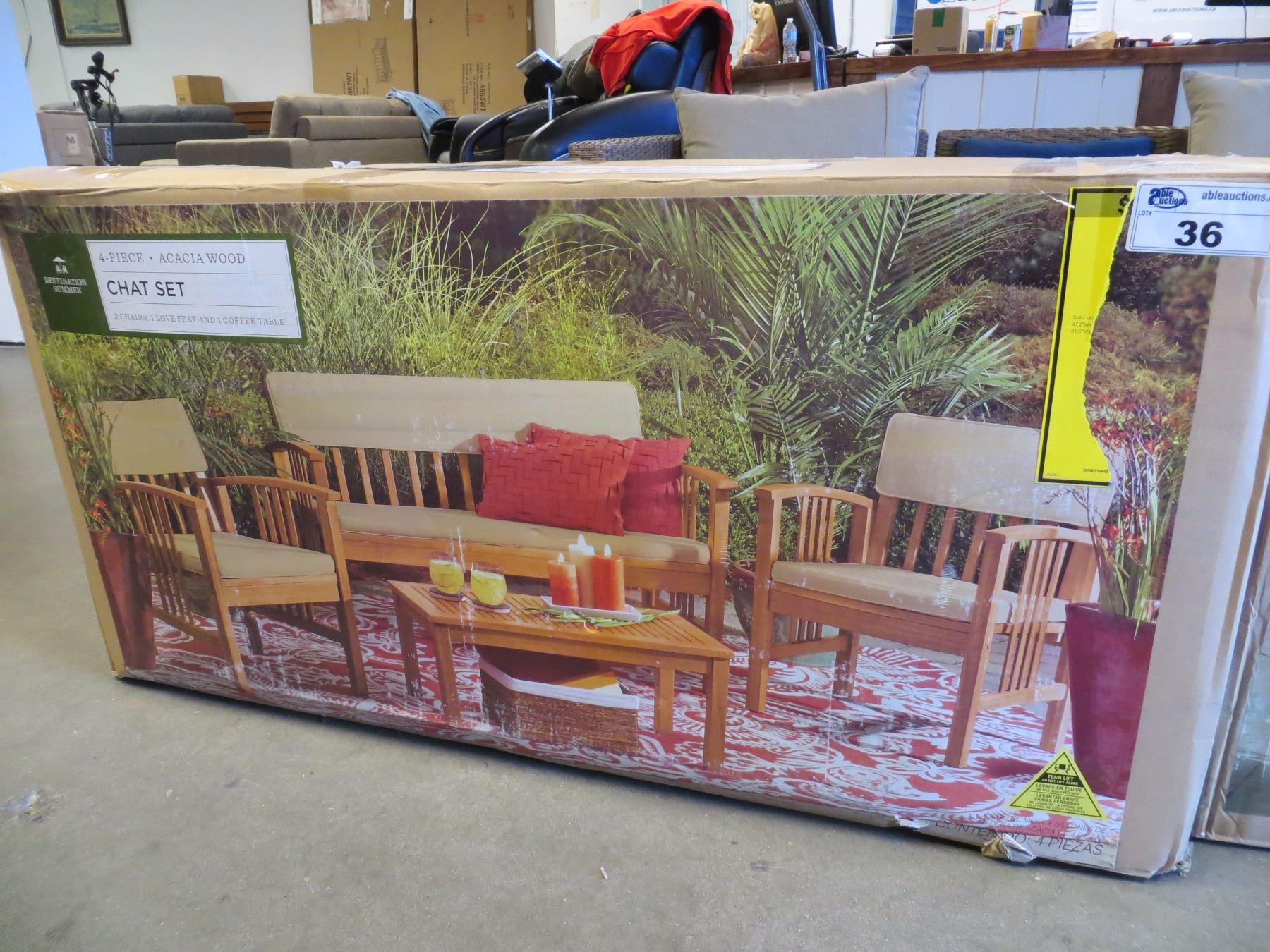 BOXED 4 PIECE ACACIA WOOD CHAT SET (2 CHAIRS, 1 LOVESEAT, 1 COFFEE TABLE)