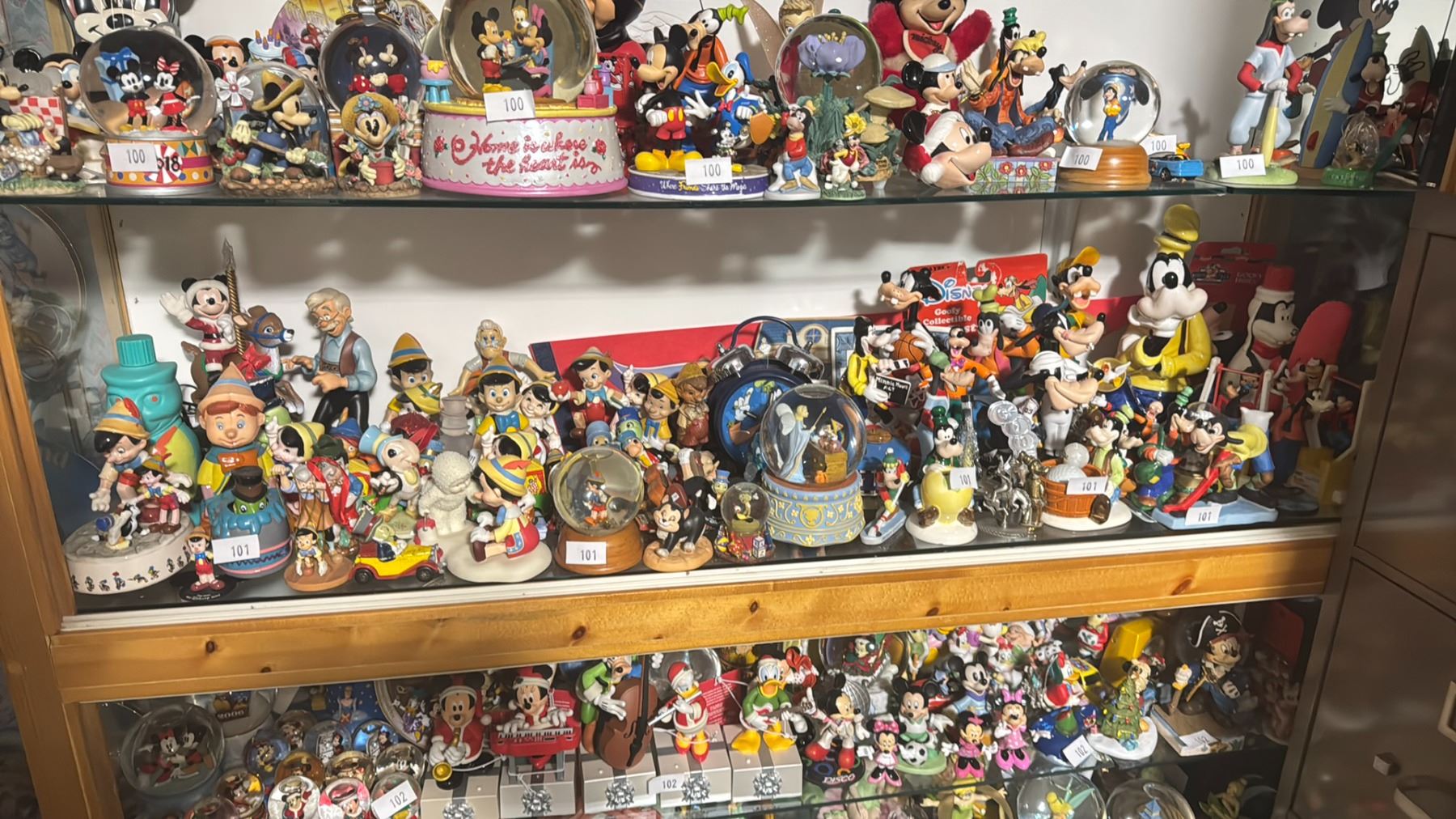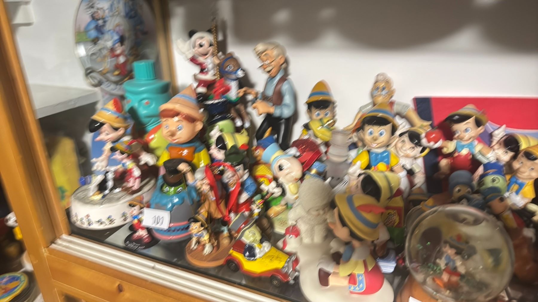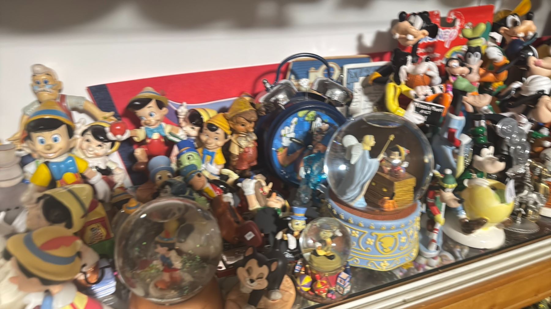 *BOXED UP* HUGE PINOCCHIO GEPPETTO & JIMINY CRICKET LOT WITH NEW & VINTAGE FIGURINES, PINNOCHIO SNOW GLOBES, GOOFY ALARM CLOCK, MANY GOOFY FIGURINES FROM VARIOUS YEARS SOME VINTAGE
