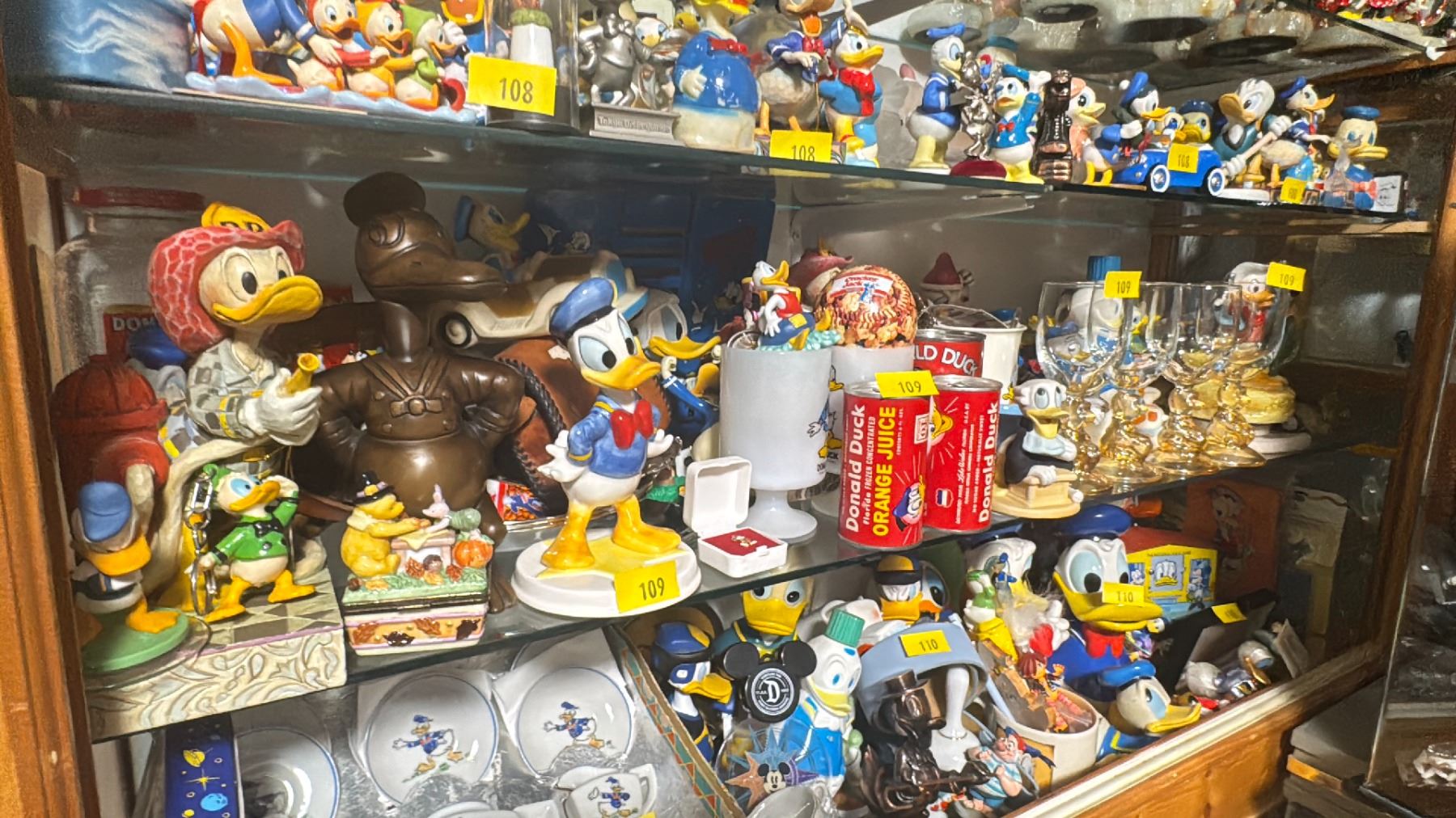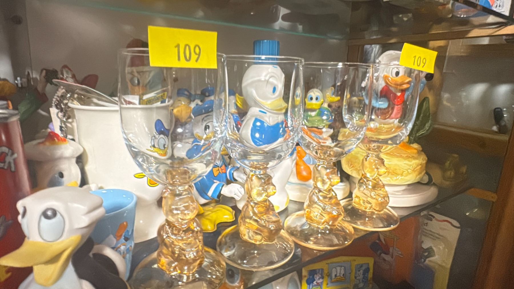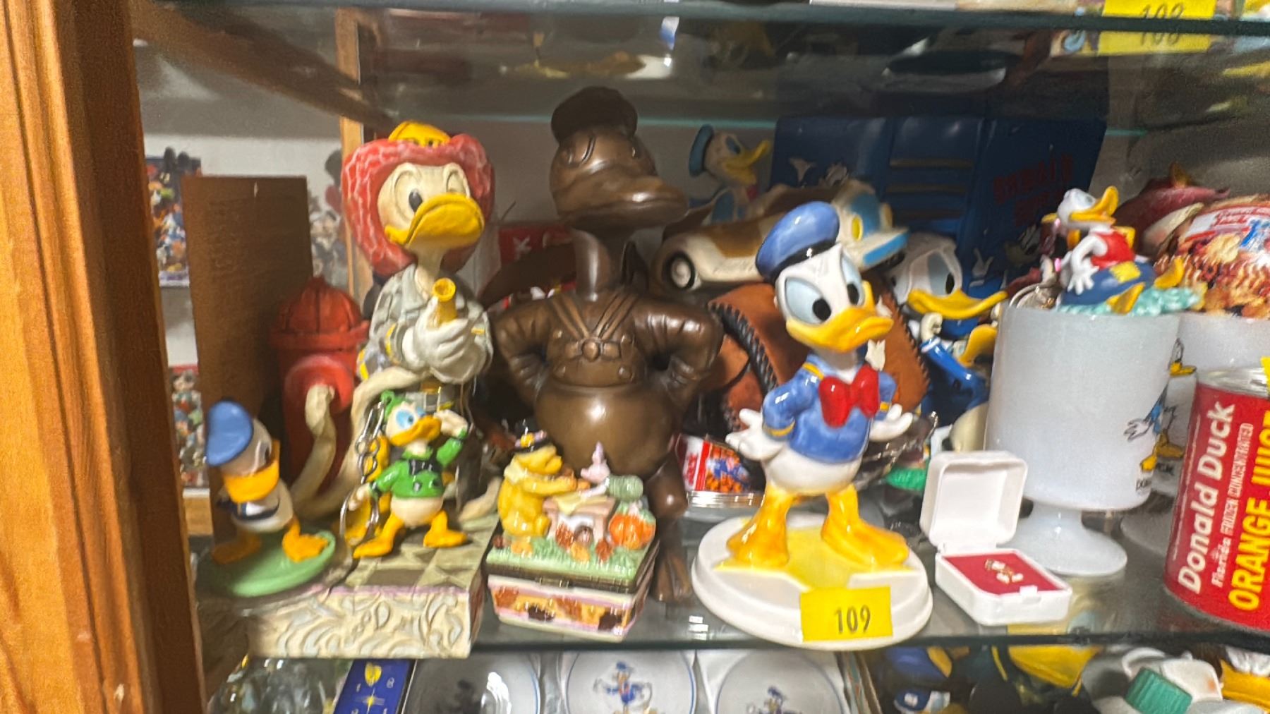 *BOXED UP* MANY VINTAGE PIECES OF DONALD DUCK, VINTAGE DONALD DUCK JUICE FROM THE 1950'S, VINTAGE BRONZE DONALD STATUE, VINTAGE WINNIE THE POOH & PIGLET PORCELAIN TRINKET BOX, MICKEY PIN, WINNIE THE POOH WINE GLASSES, DONALD MUGS & MANY OTHER TREASURES