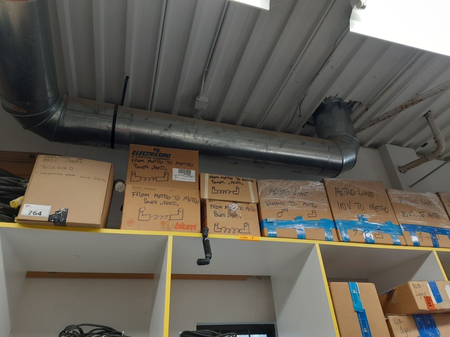 BOXES OF ASSORTED HEAVY DUTY CABLING, EXTENSION CORDS, FEEDER CORDS & CONNECTORS LOCATED ON TOP OF WHITE CABLE SHELVING UNIT