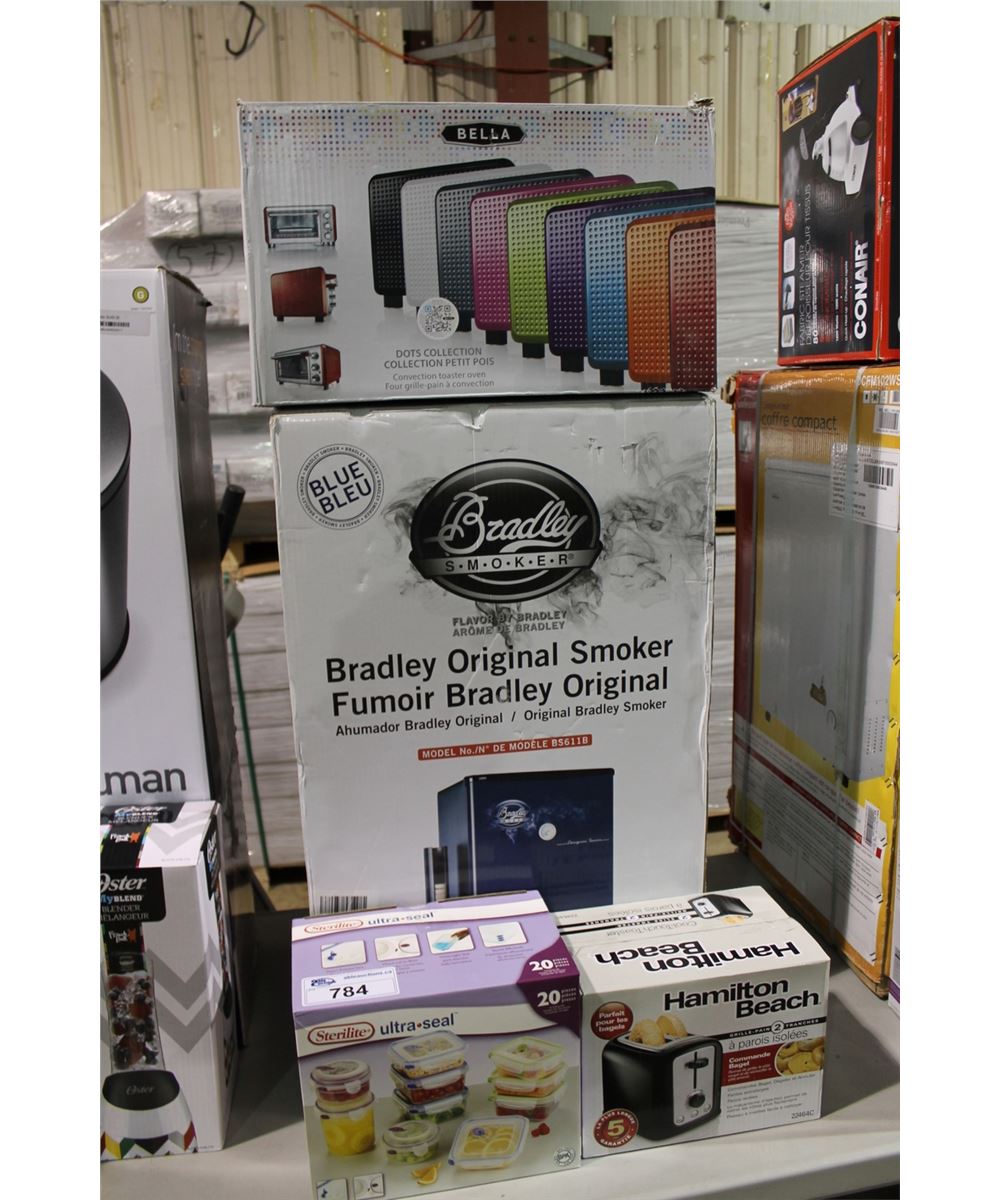 BRADLEY SMOKER, BELLA TOASTER OVEN, HAMILTON BEACH TOASTER, AND STERILITE CONTAINER SET
