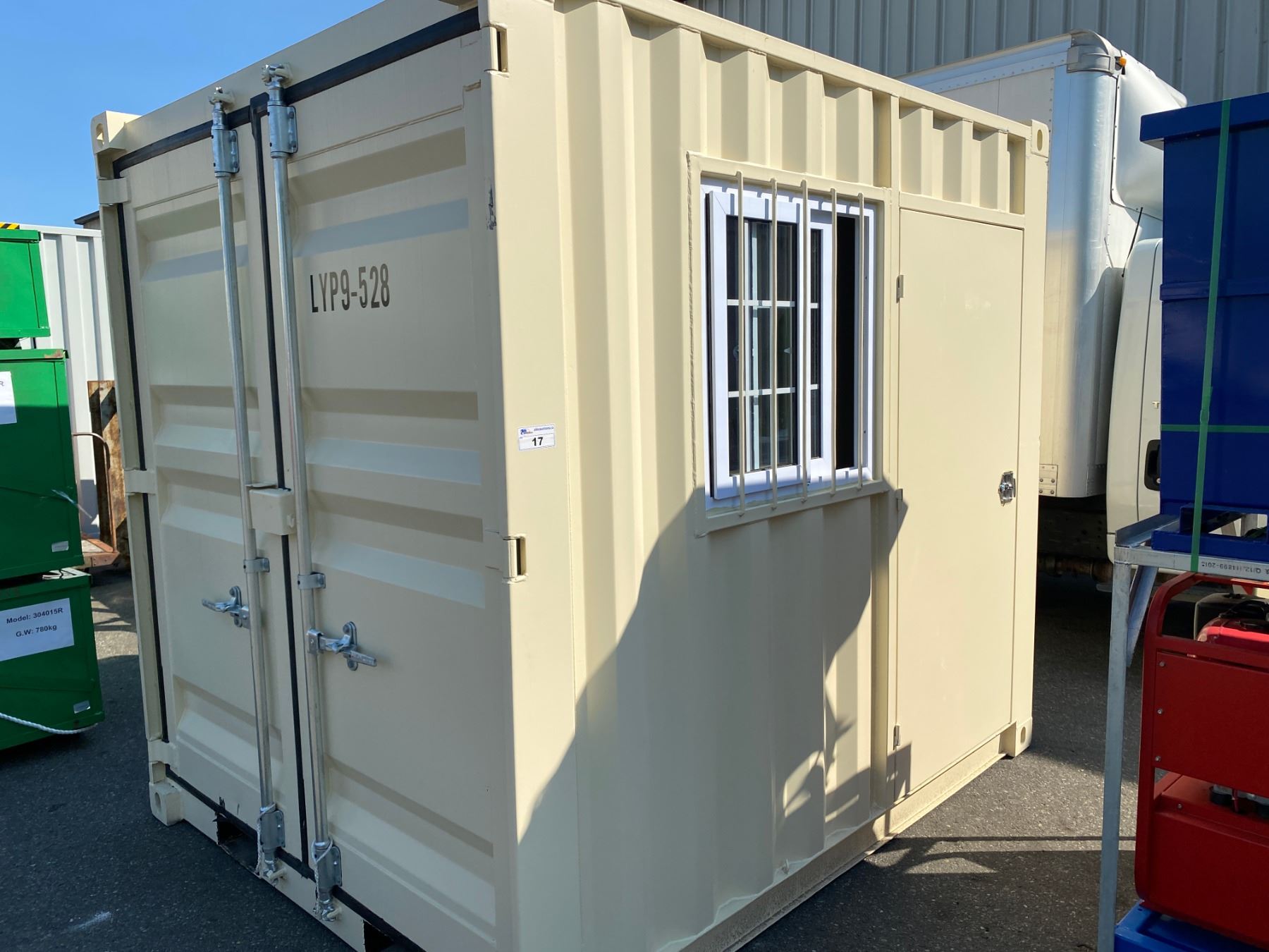 BRAND NEW 9' SHIPPING STORAGE CONTAINER, PORTABLE OFFICE, WITH DOOR, WINDOW AND REAR DOOR