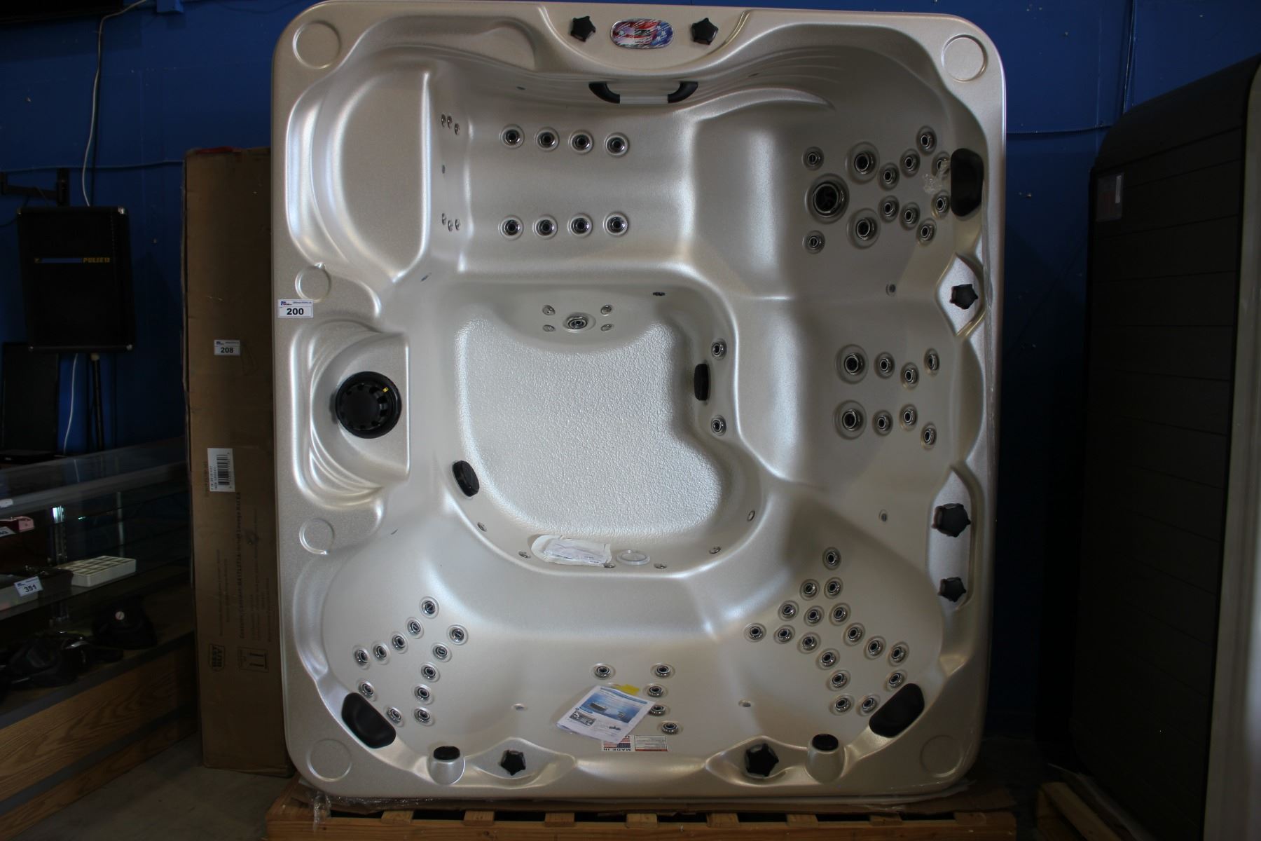 BRAND NEW CAL-SPA MADE IN USA 100" X 100" PHANTOM BASE HOT TUB FEATURING: 85 HALO SS JETS (16 RAIN JETS), LED WATERFALL, 2 X 6 BHP PUMPS, HYDROCLEAR OZONATOR, LED SPA LIGHT WITH PREMIUM LED LIGHTING PACKAGE, FREEDOM BLUETOOTH SOUND SYSTEM, 3 CONTOUR PILLOWS