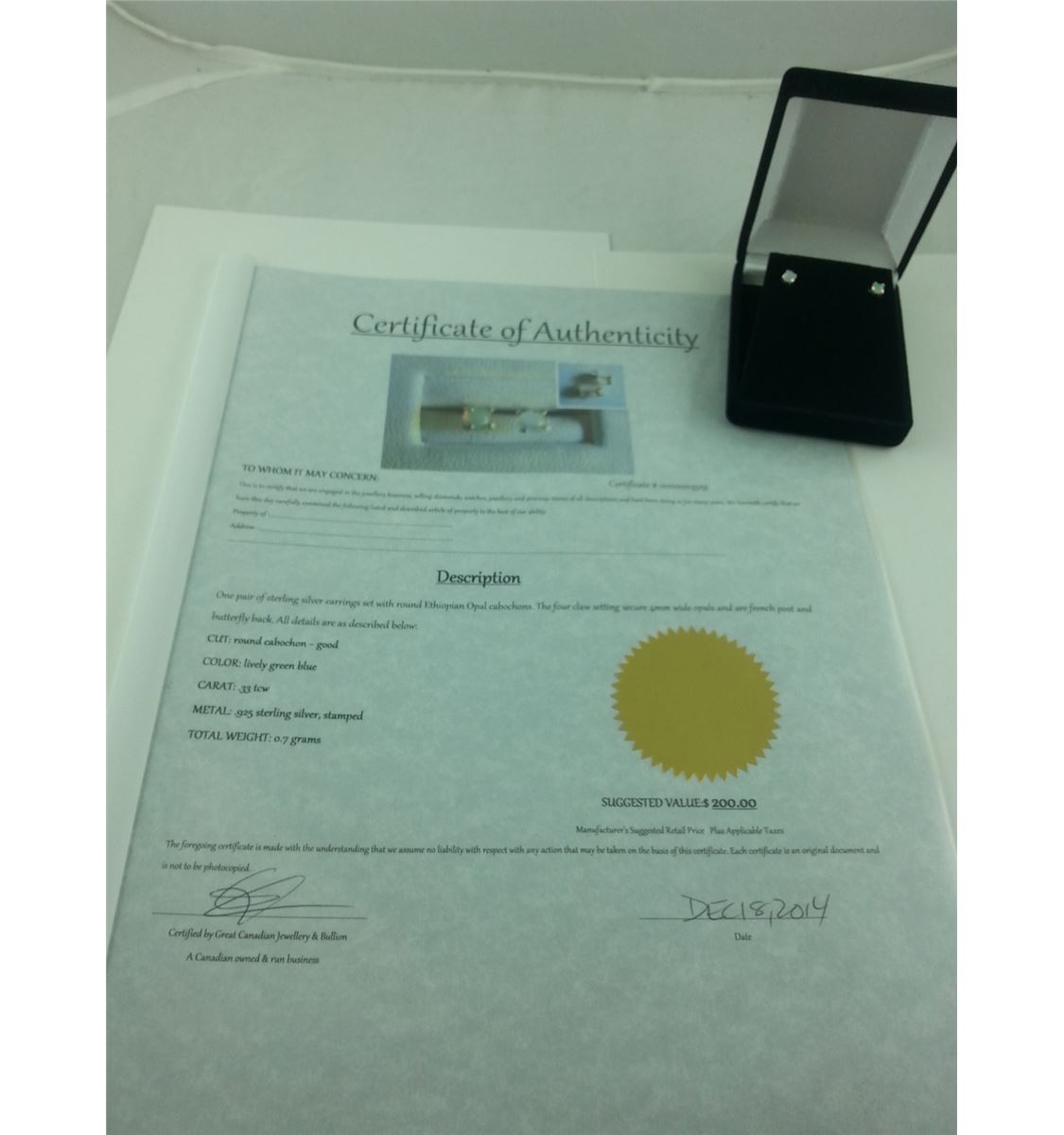 BRAND NEW ETHIOPIAN OPAL STUD EARRINGS. STERLING SILVER. INCLUDES $200 CERTIFICATE