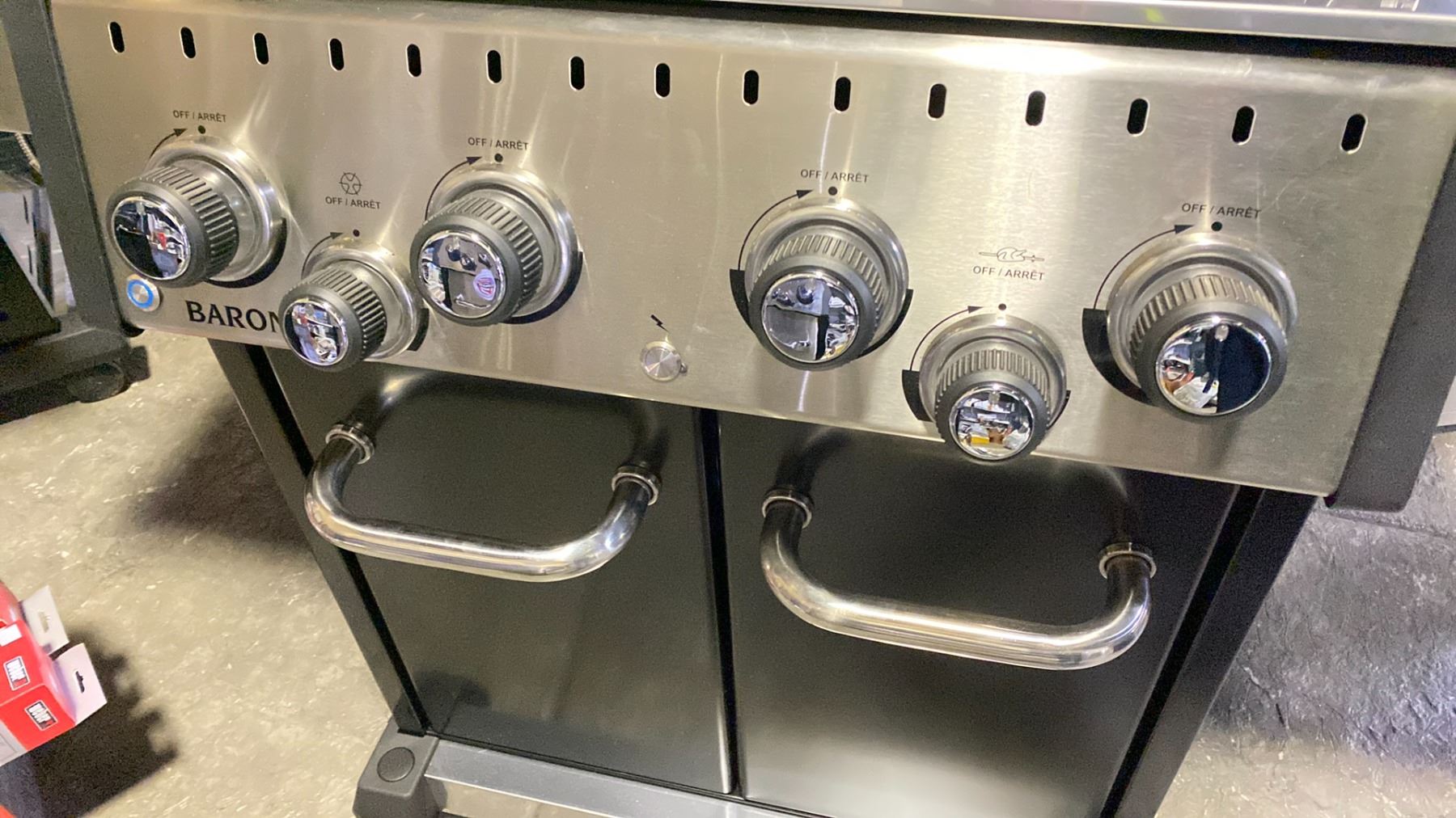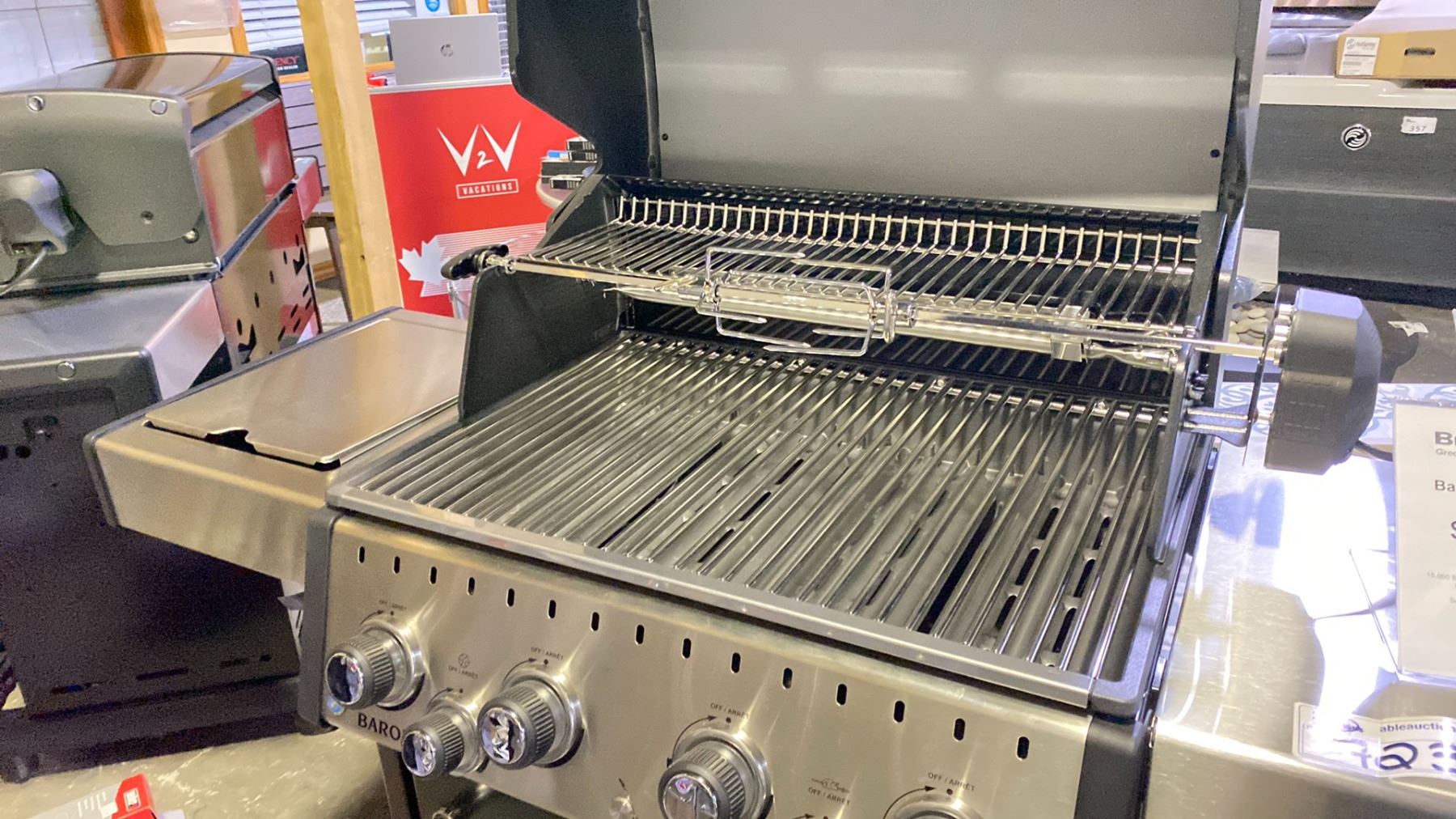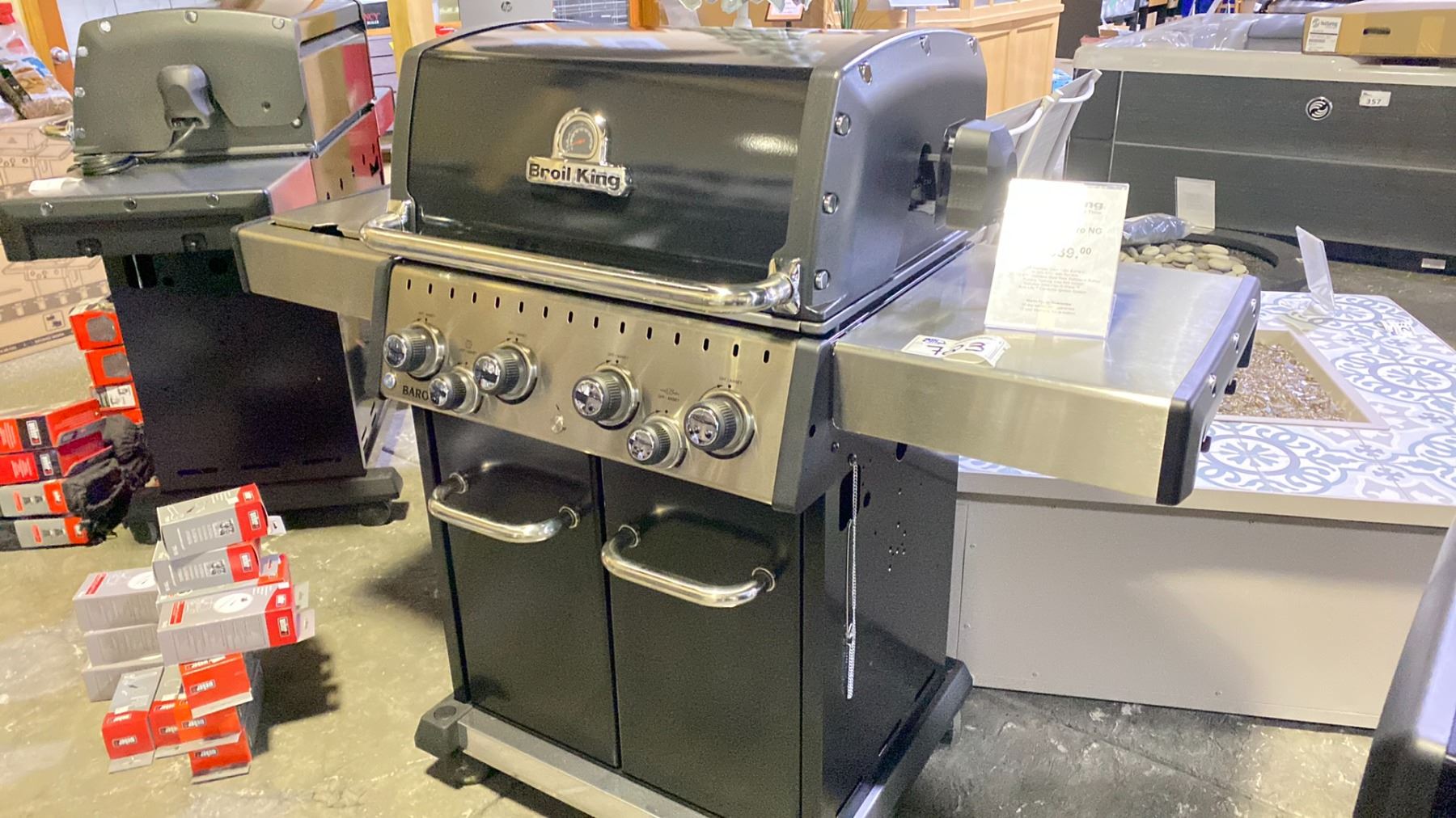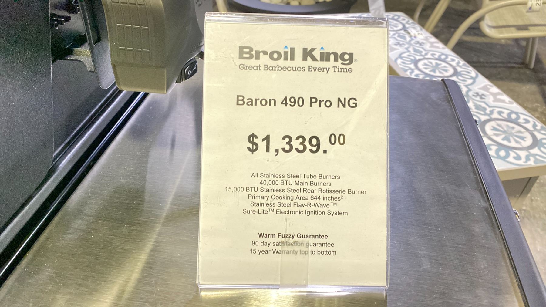 BROIL KING BARON 490 PRO NG BBQ. ALL STAINLESS STEEL TUBE BURNERS, 40,000 BTU MAIN BURNERS, 15,000 STAINLESS STEEL REAR ROTISSERIE BURNER, PRIMARY COOKING AREA 644 INCHES, STAINLESS STEEL FLAV-R-WAVE SURE-LITE ELECTRONIC IGNITION SYSTEM RETAIL $1339