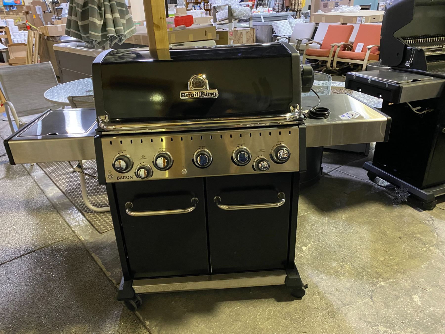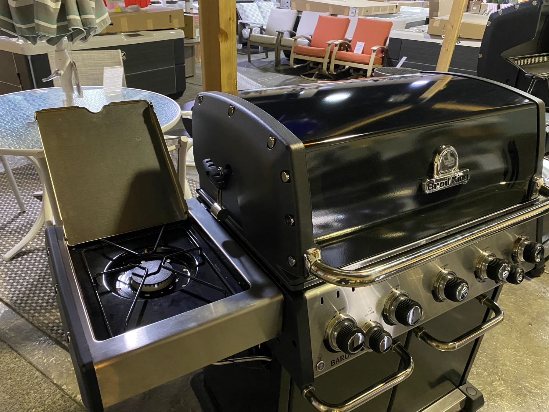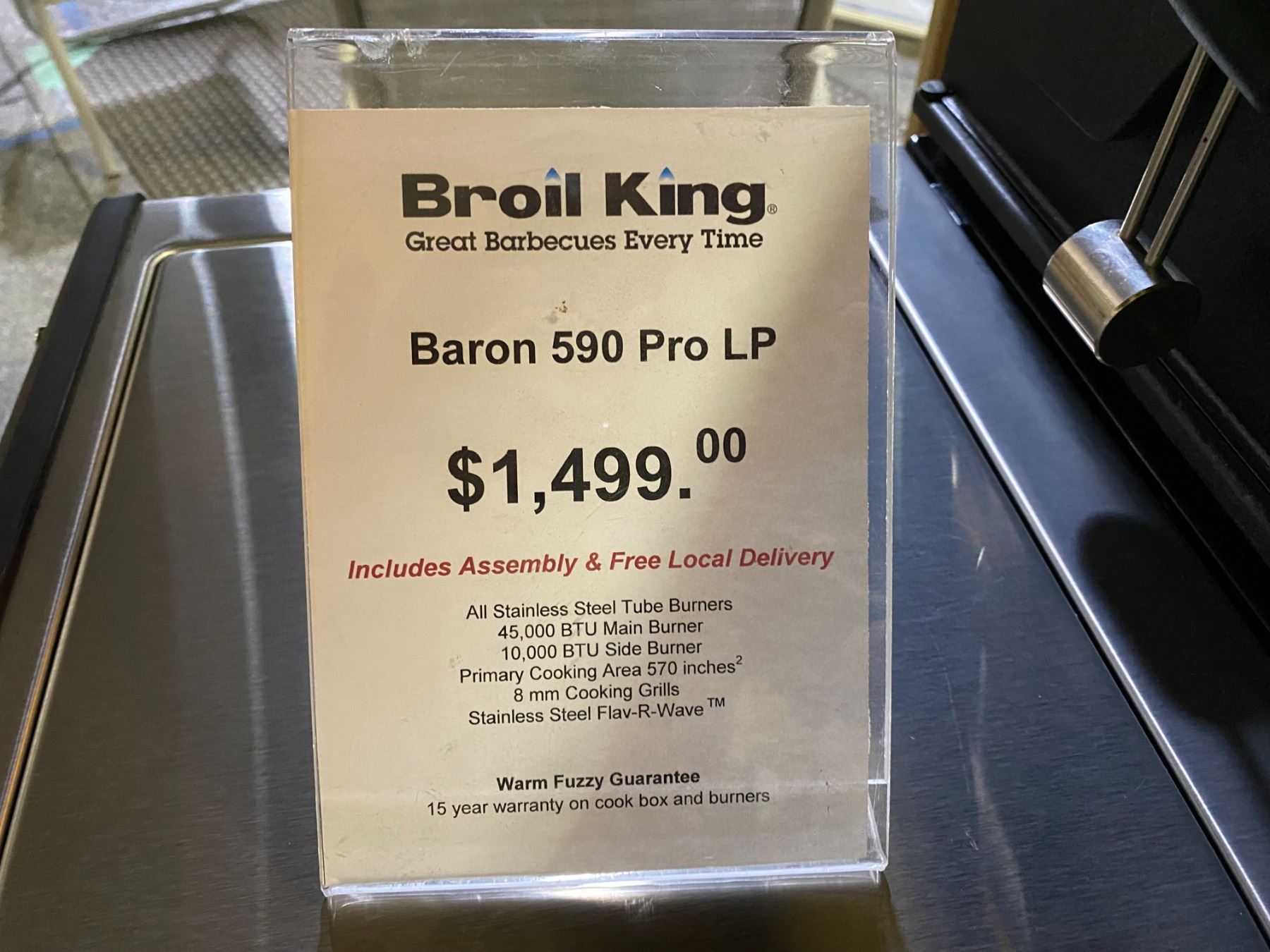 BROIL KING BARON 590 PRO LP PROPANE BBQ. ALL STAINLESS STEEL TUBE BURNERS, 45,000 BTU MAIN BURNER, 10,000 BTU SIDE BURNER, PRIMARY COOKING AREA 570 SQ IN, 8 MM COOKING GRILLS, STAINLESS STEEL FLAV-R-WAVE, WITH ROTISSERIE