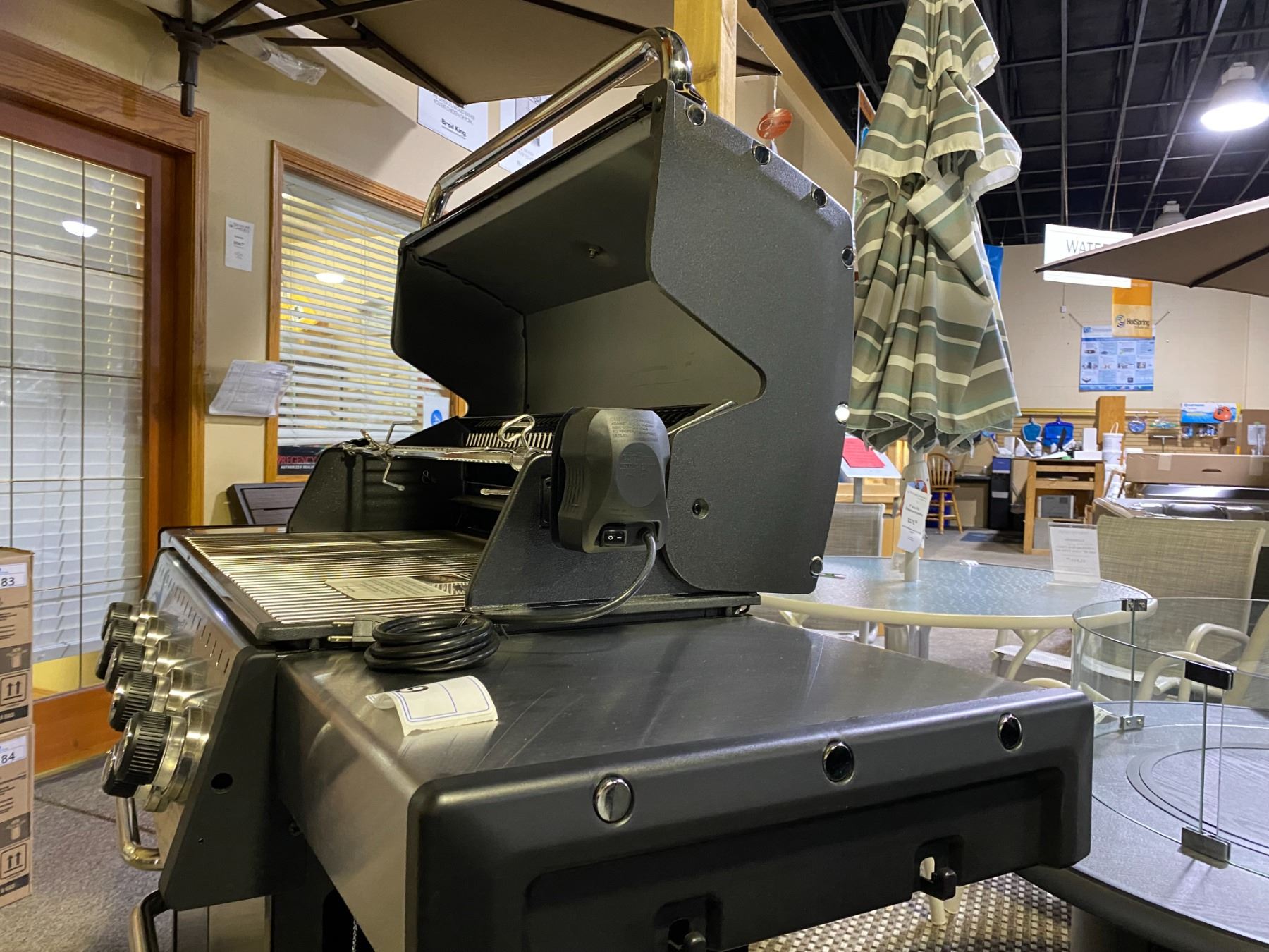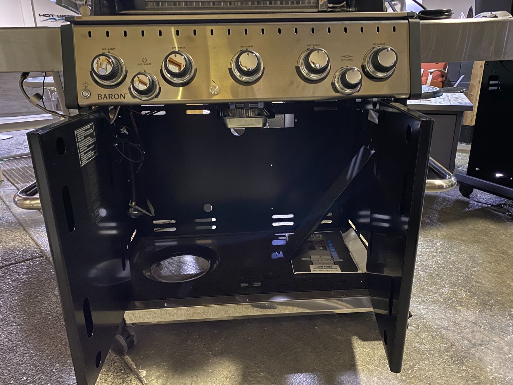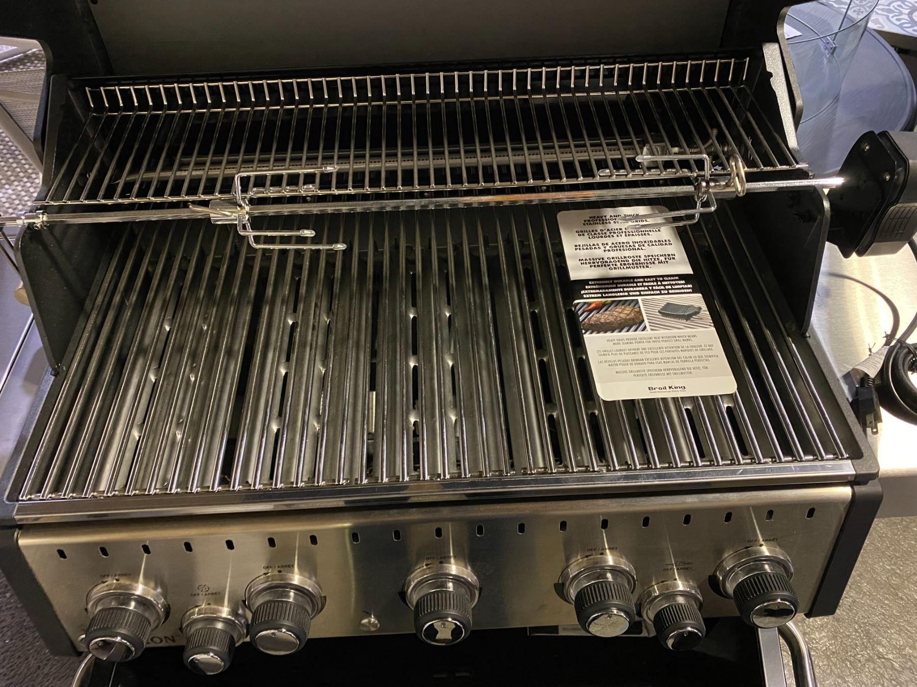 BROIL KING BARON 590 PRO LP PROPANE BBQ. ALL STAINLESS STEEL TUBE BURNERS, 45,000 BTU MAIN BURNER, 10,000 BTU SIDE BURNER, PRIMARY COOKING AREA 570 SQ IN, 8 MM COOKING GRILLS, STAINLESS STEEL FLAV-R-WAVE, WITH ROTISSERIE