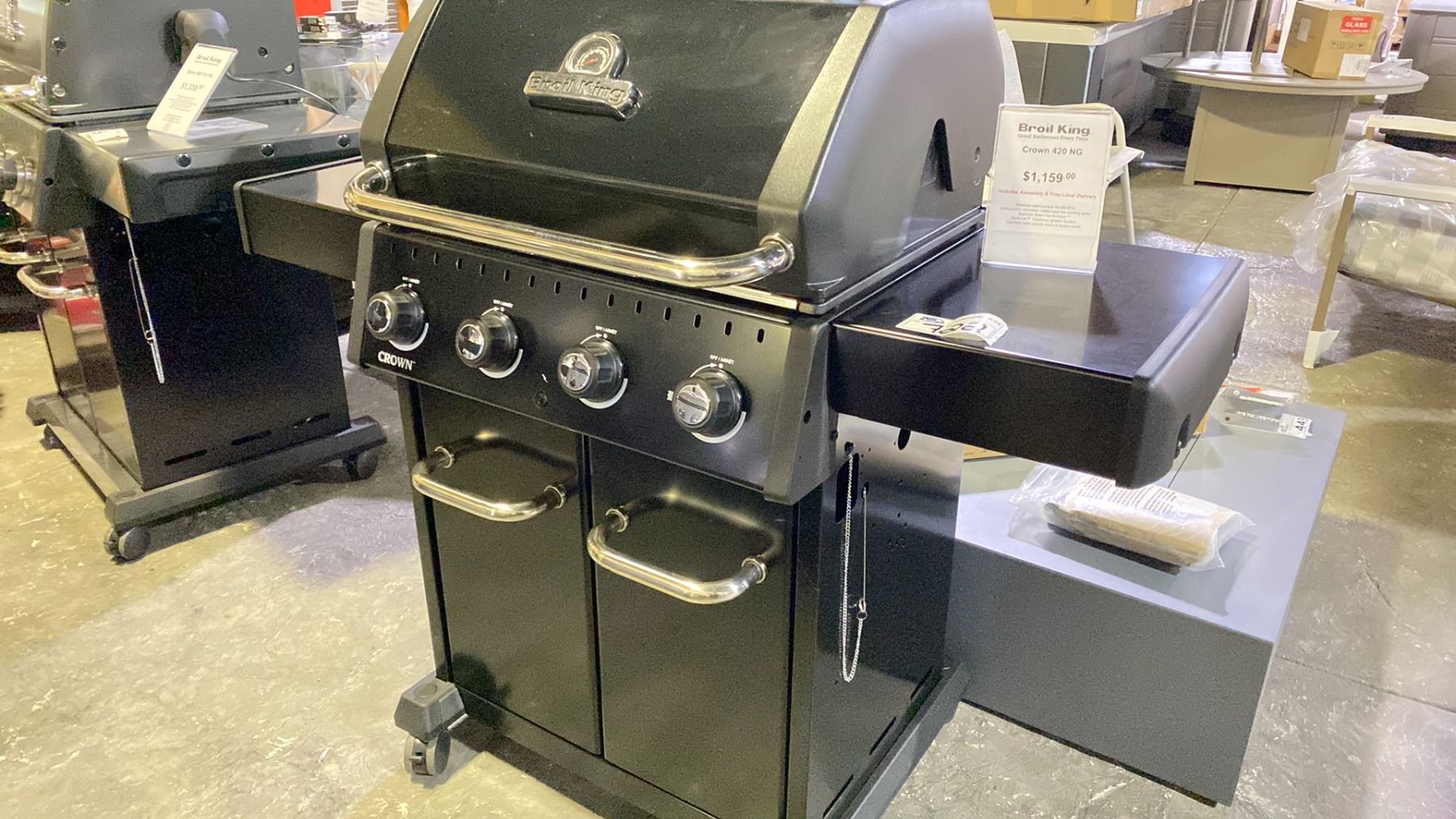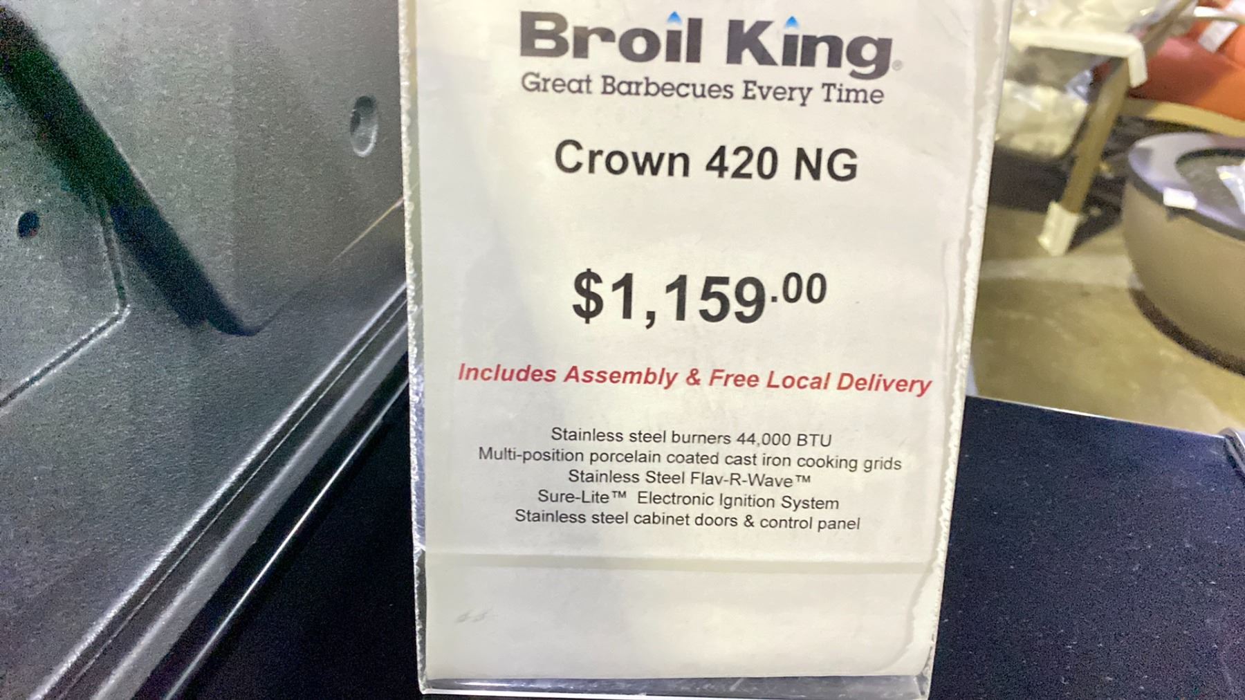 BROIL KING CROWN 420 NAT GAS BBQ. STAINLESS STEEL BURNERS 44,000 BTU, MULTI-POSITION PORCELAIN COATED CAST IRON COOKING GRIDS, STAINLESS STEEL FLAV-R-WAVE, SURE-LITE ELECTRONIC IGNITION SYSTEM, STAINLESS STEEL CABINET DOORS & CONTROL PANEL