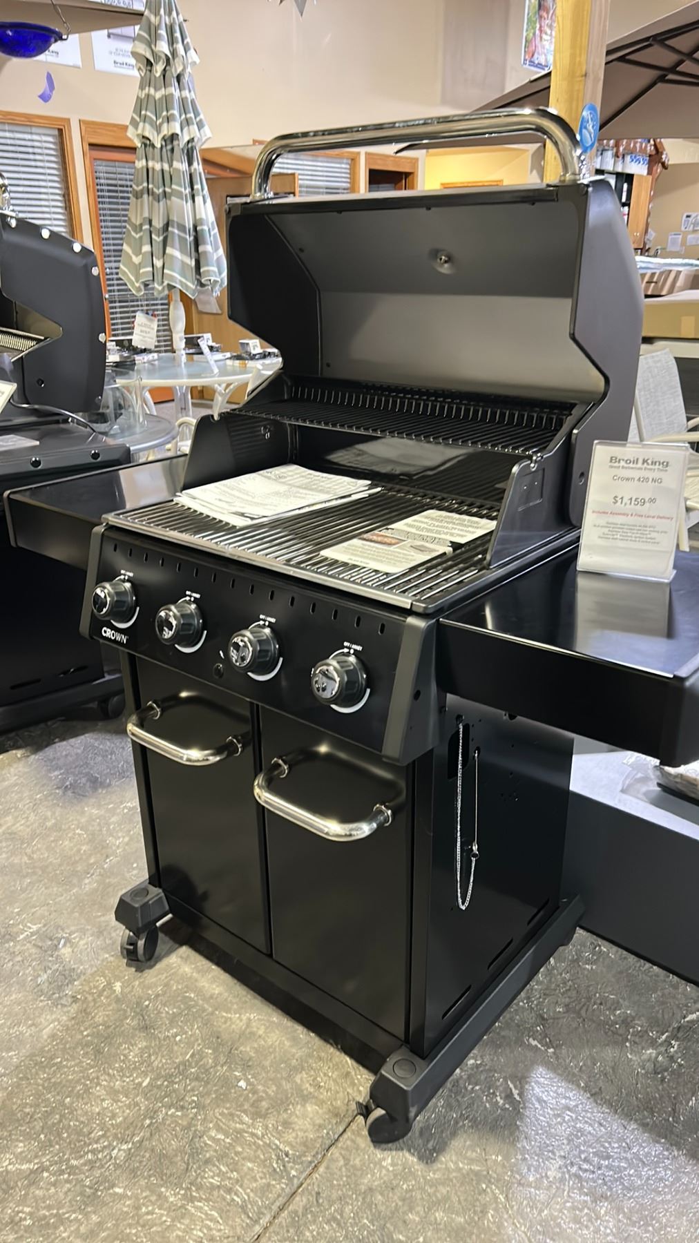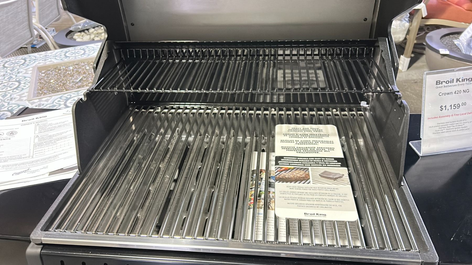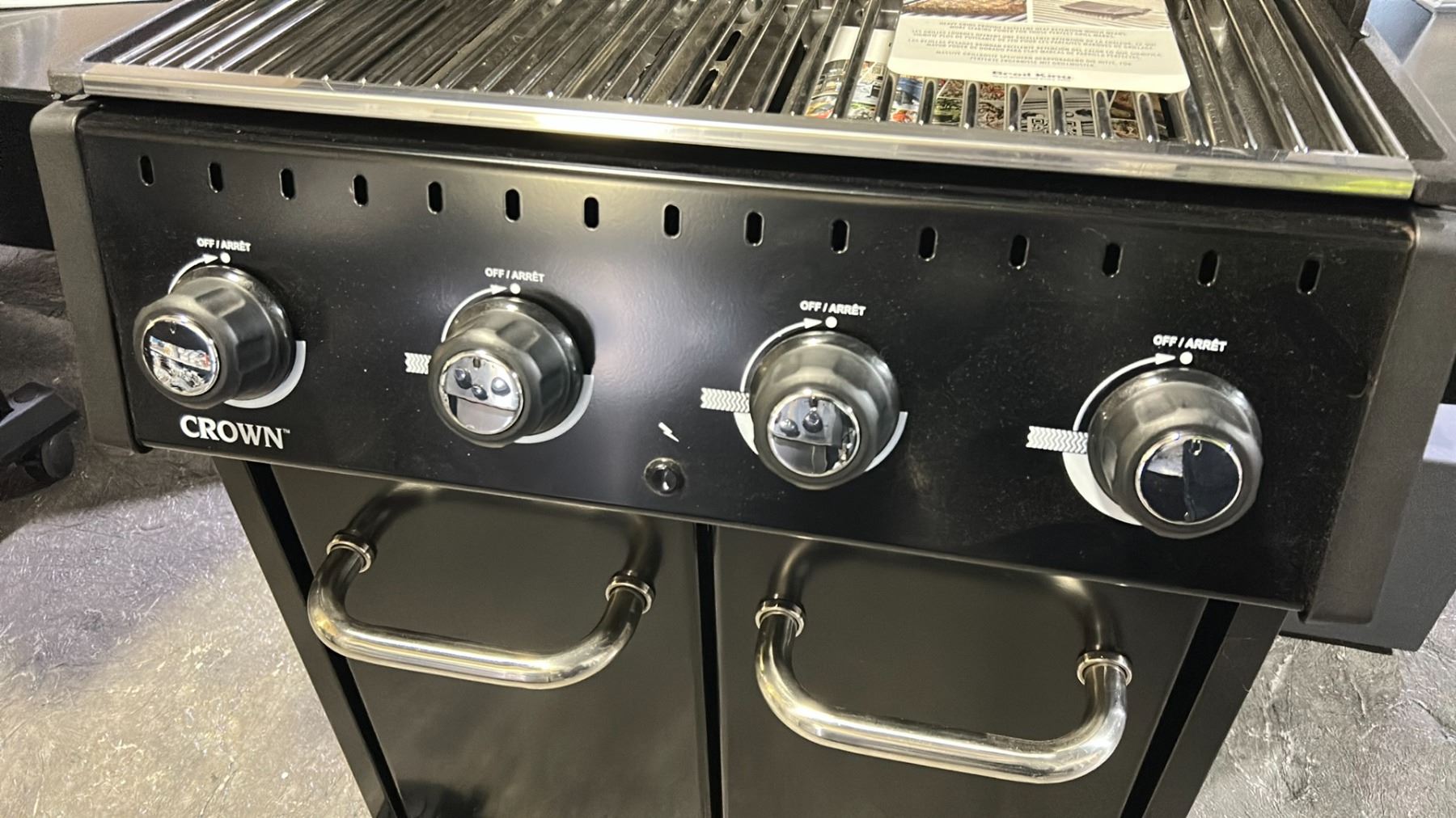 BROIL KING CROWN S490 PROPANE BBQ. ASSEMBLED. STAINLESS STEEL BURNERS 44,000 BTU, STAINLESS STEEL SIDE BURNER 10,000 BTU, MULTI-POSITION PORCELAIN COATED CAST IRON COOKING GRIDS, 635 SQ IN COOKING AREA, STAINLESS STEEL FLAV-R-WAVE, SURE-LITE ELECTRONIC IGNITION SYSTEM, STAINLESS STEEL CABINET DOORS AND CONTROL PANEL RETAILS $1200
