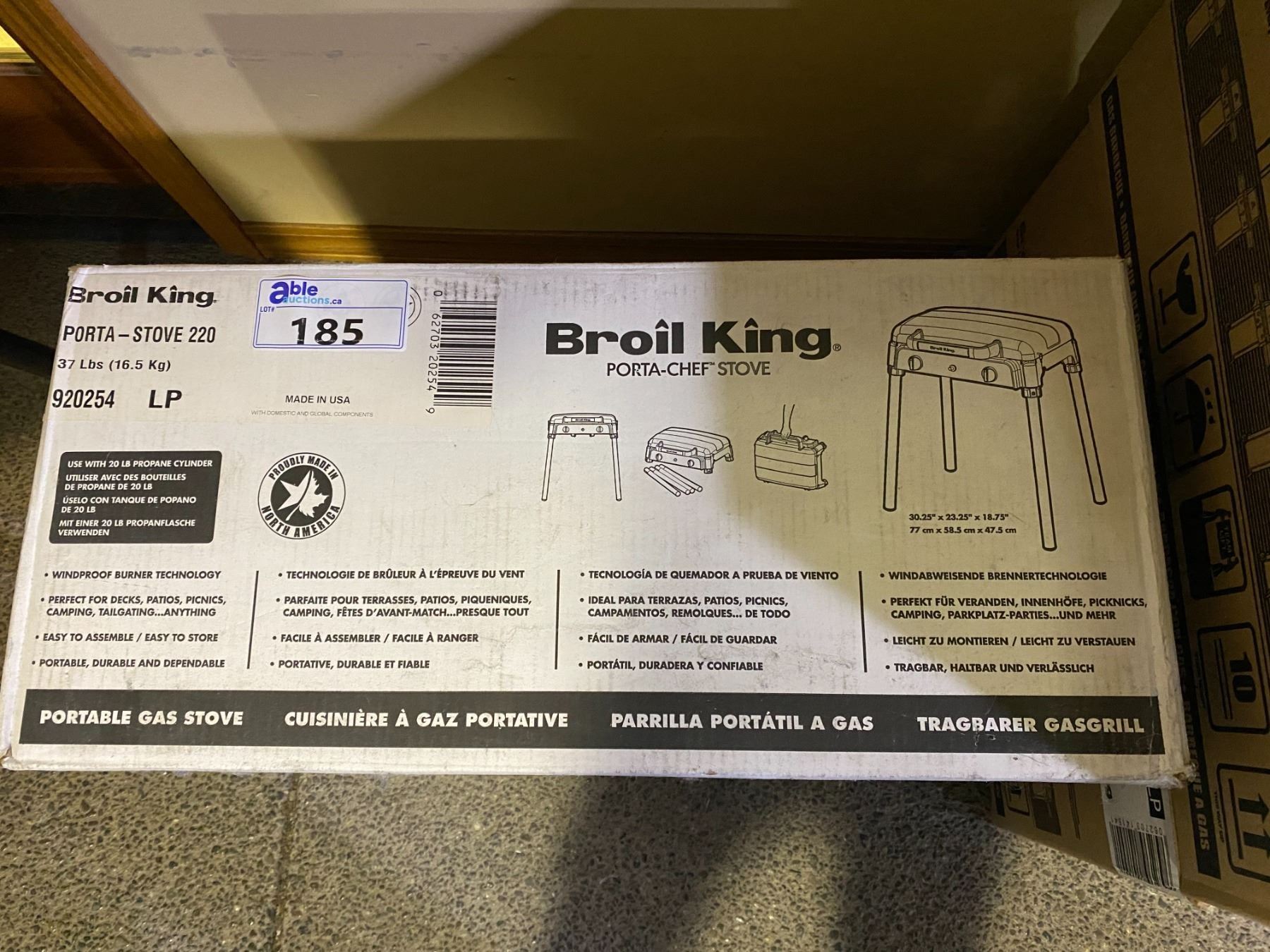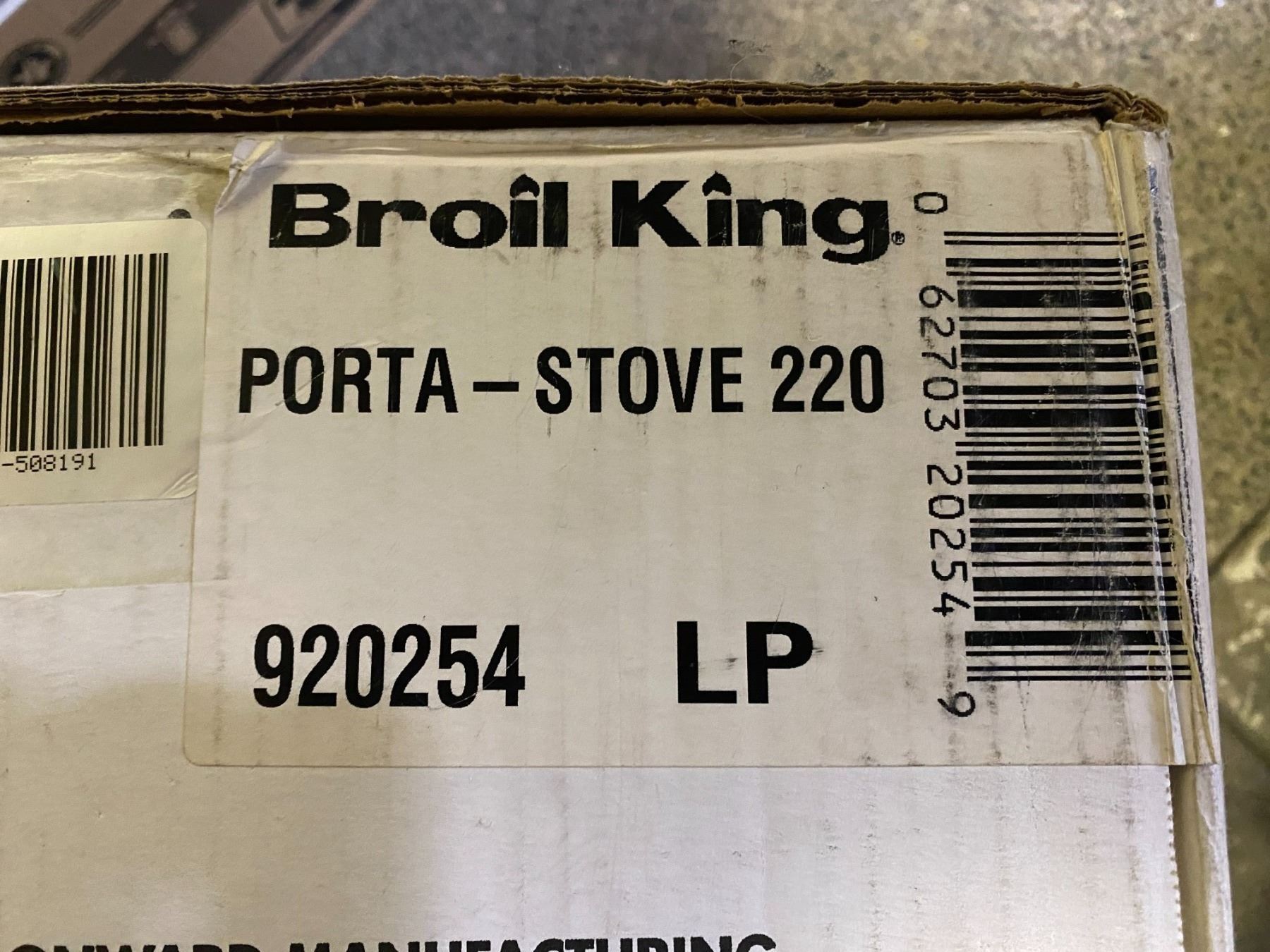 BROIL KING PORTA-STOVE 220. CAST IRON WIND-PROOF BURNERS, 284 SQ IN COOKING AREA, 17,000 BTU, PORCELAIN COATED STEEL WIRE GRILLS, SURE-LITE IGNITION SYSTEM. NEW IN BOX NOT ASSEMBLED