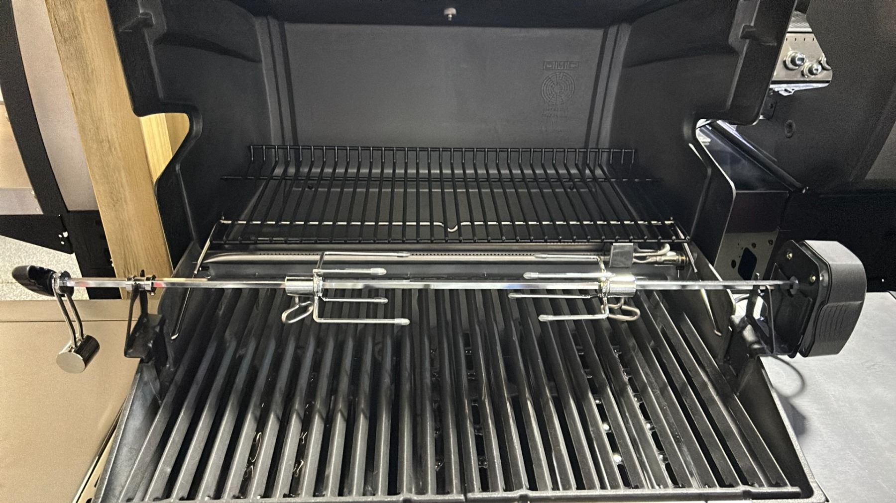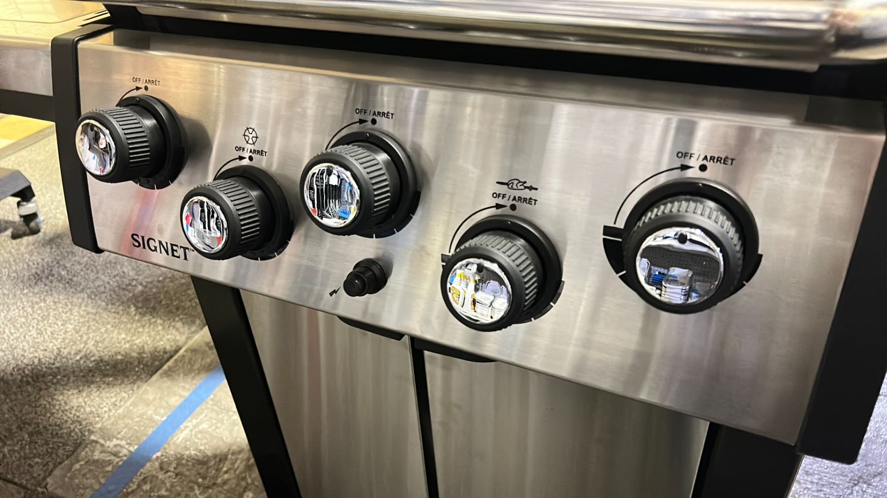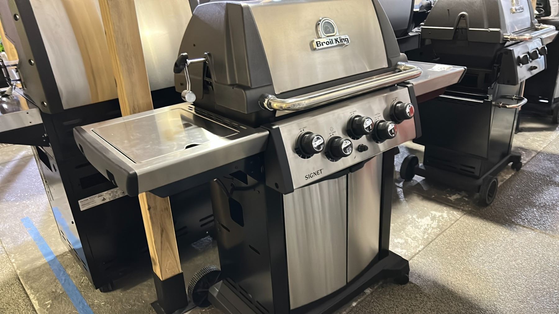 BROIL KING SIGNET 390 LP PROPANE BBQ. 3 STAINLESS STEEL DUAL-TUBE BURNERS 44,000 BTU, STAINLESS STEEL ROTISSERIE REAR BURNER 15,000 BTU, STAINLESS STEEL SIDE BURNER 10,000 BTU, HEAVY DUTY PORCELAIN COATED CAST IRON COOKING GRIDS, PRIMARY COOKING AREA 400 SQ IN, STAINLESS STEEL FLAV-R-WAVE, SURE-LITE ELECTRONIC IGNITION SYSTEM, DROP DOWN SIDE SHELVES, ROTISSERIE
