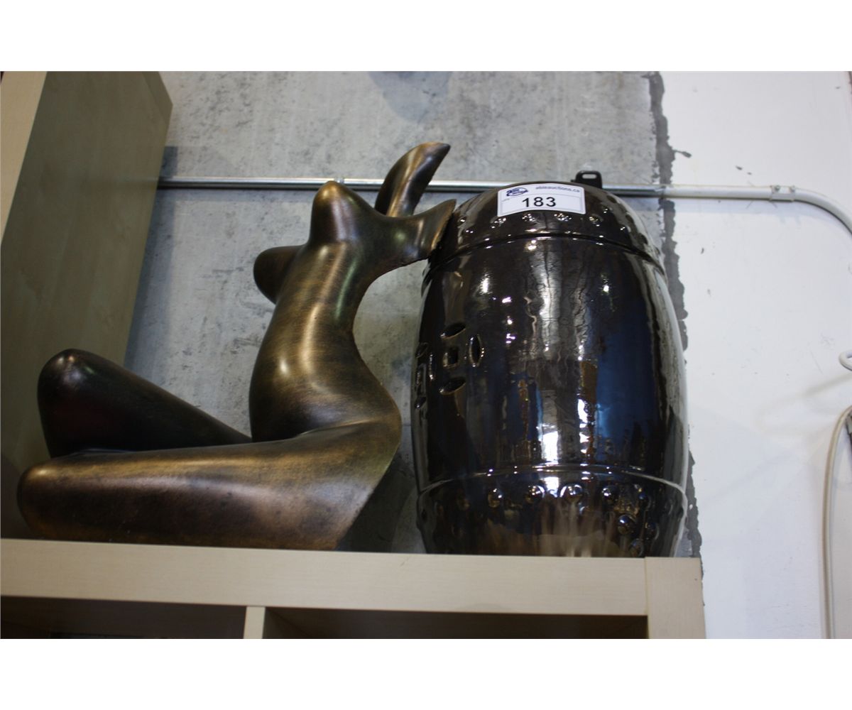 BRONZE COLORED FEMALE BODY STATUE AND DECORATIVE BARREL