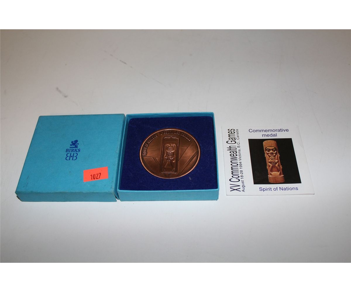 BRONZE COMMEMORATIVE 1994 VICTORIA COMMONWEALTH GAMES PARTICIPATION MEDAL WITH BIRKS DISPLAY BOX