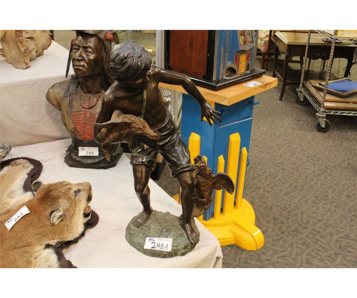 BRONZE SCULPTURE OF BOY WITH TWO ROOSTERS