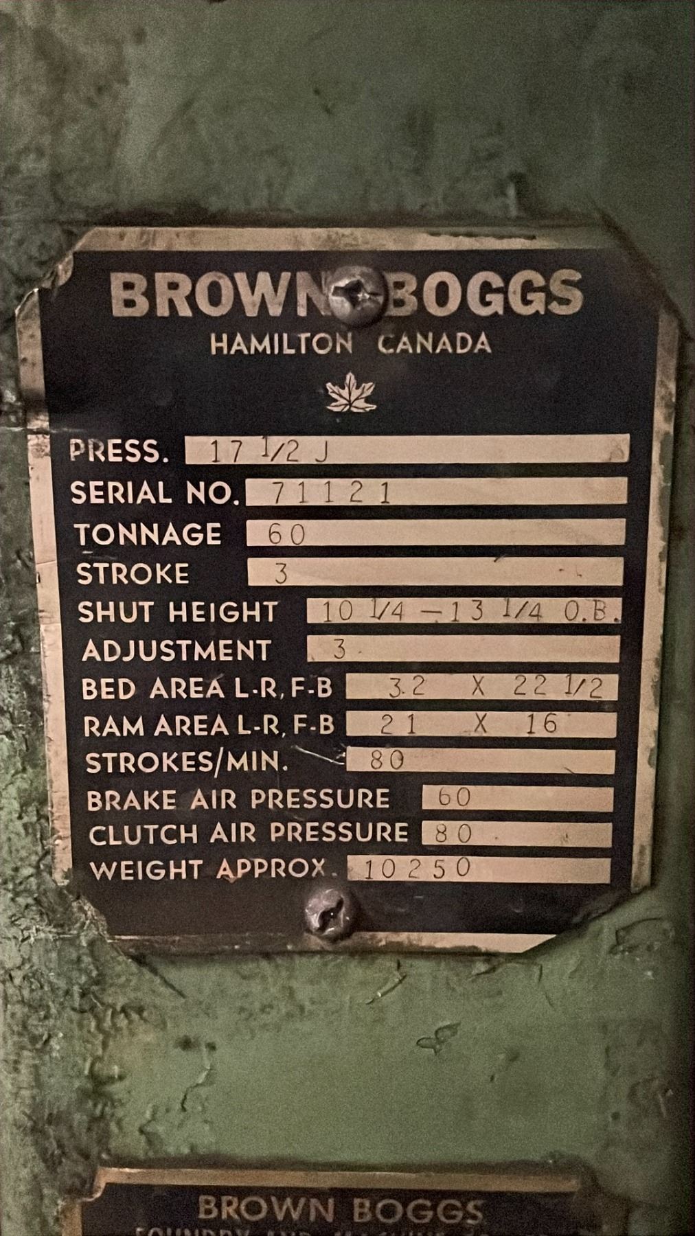 BROWN BOGGS 17 1/2 J INDUSTRIAL OBI PUNCH PRESS W/HONEYWELL WPC CLUTCH BRAKE CONTROL *FRI SEP 5 OR SAT SEP 6 REMOVAL