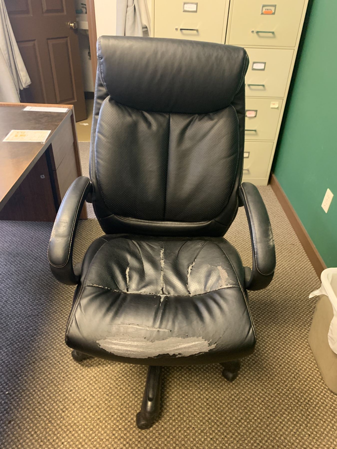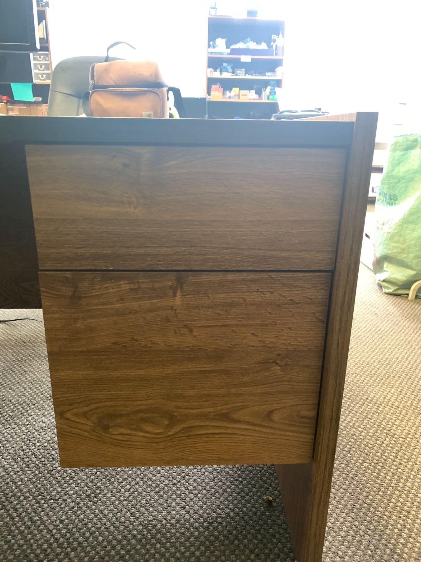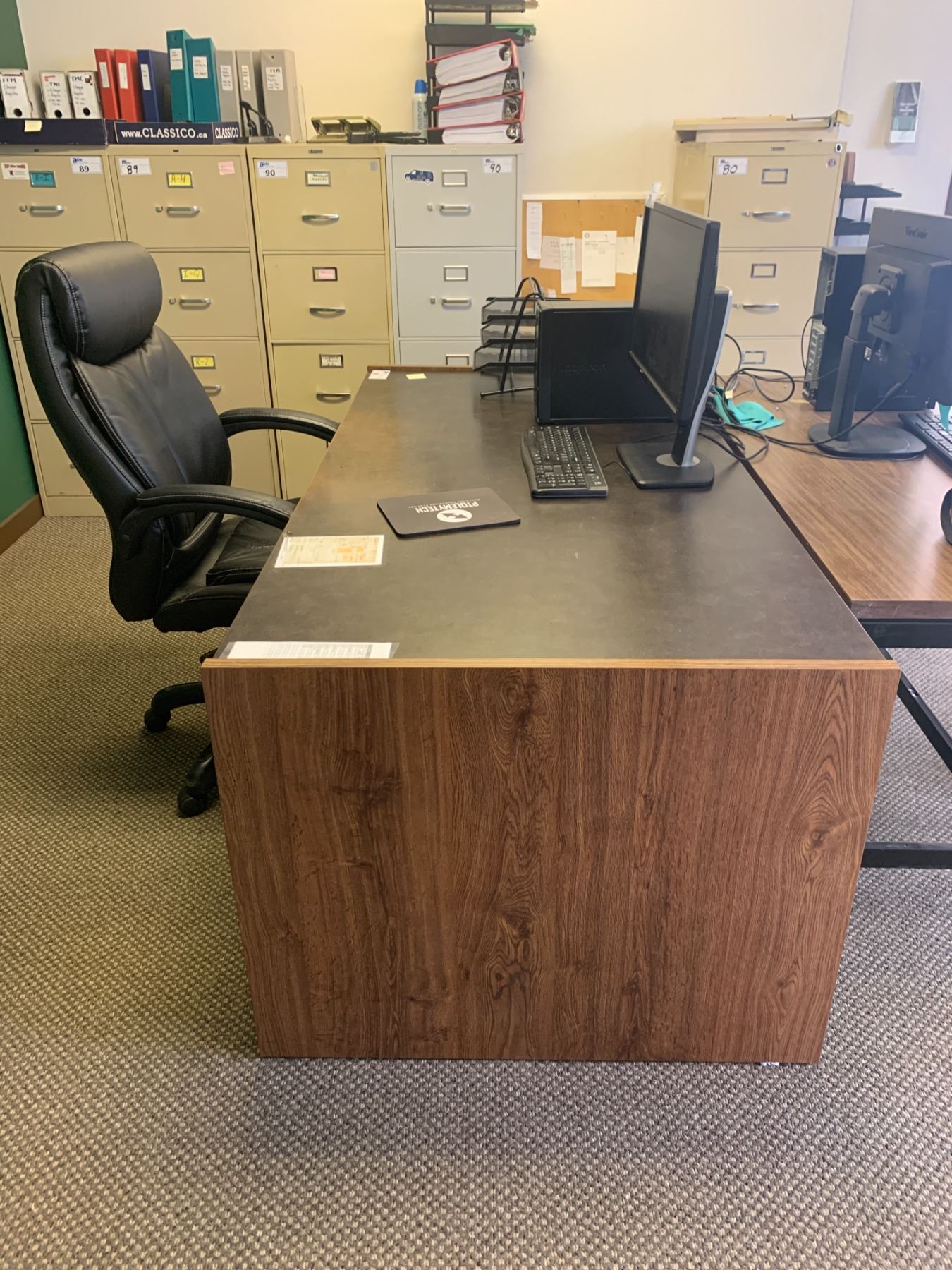 BROWN EXECUTIVE 6' X 3' OFFICE DESK WITH A BLACK LEATHER HIGH BACK OFFICE CHAIR