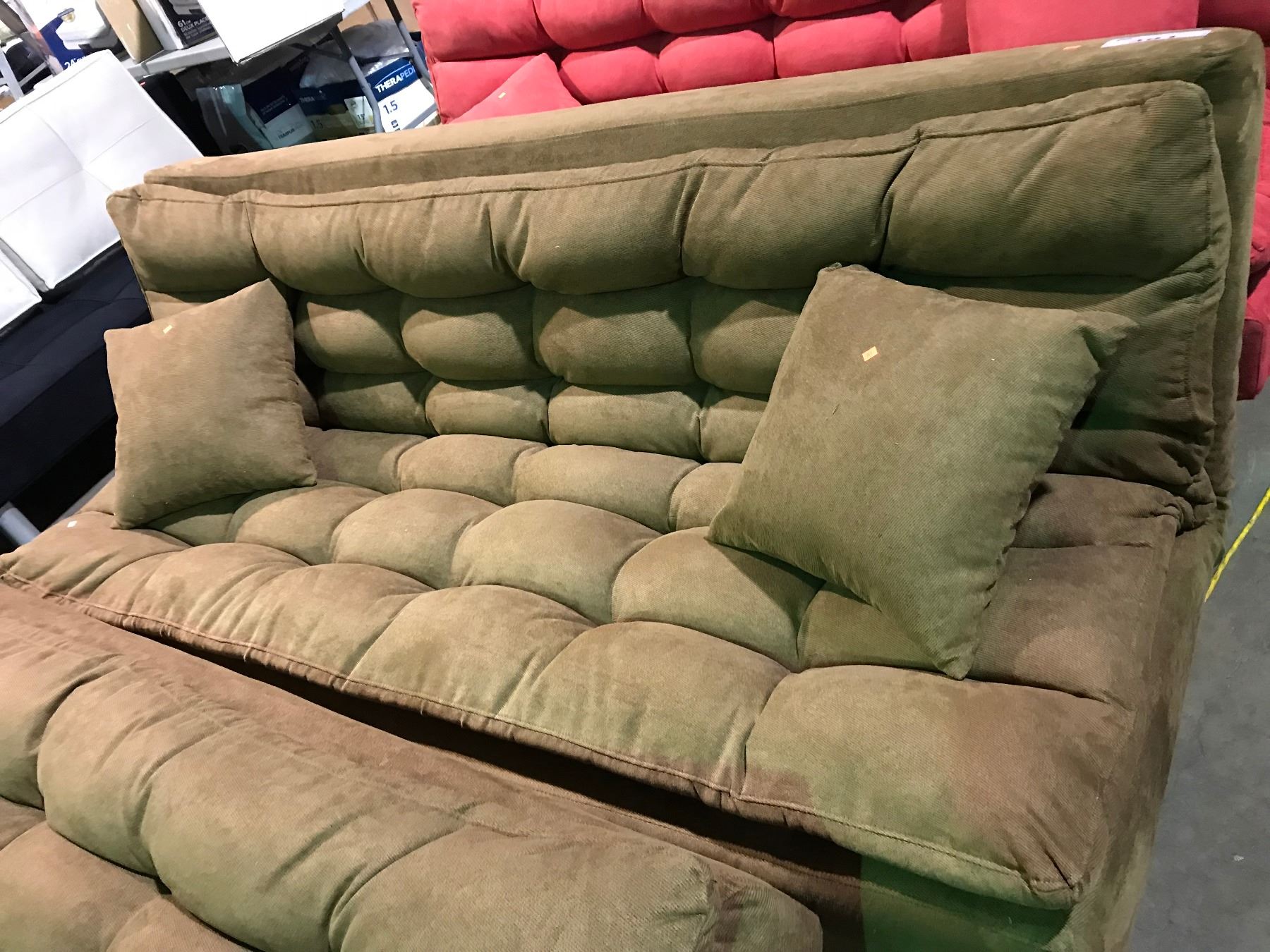 BROWN FABRIC FUTON COUCH WITH 2 THROW PILLOWS