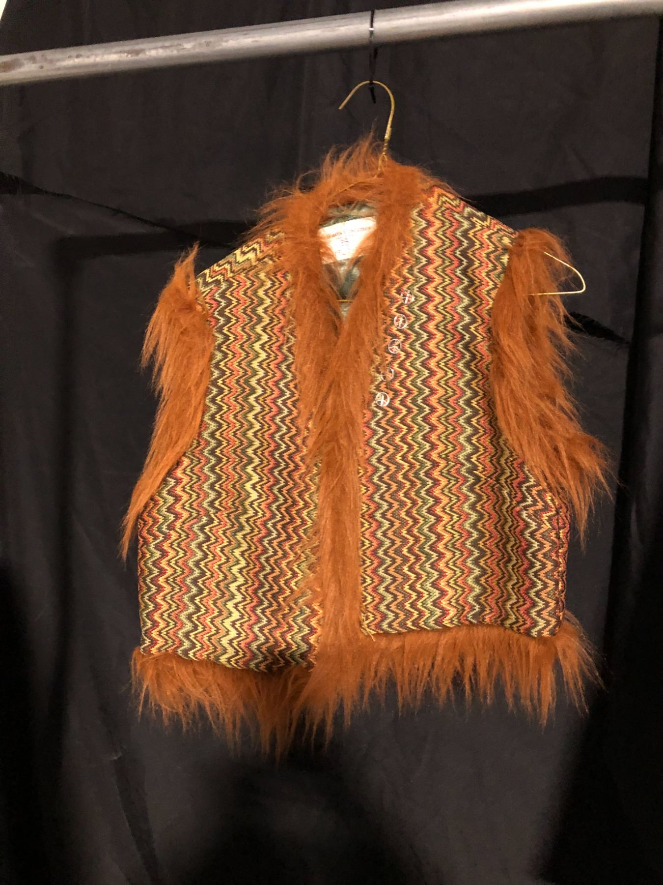 BROWN/GREEN/ORANGE 70'S VINTAGE SHAG VEST, LIGHT BLUE SKIRT, DAILY RENTAL $50.00