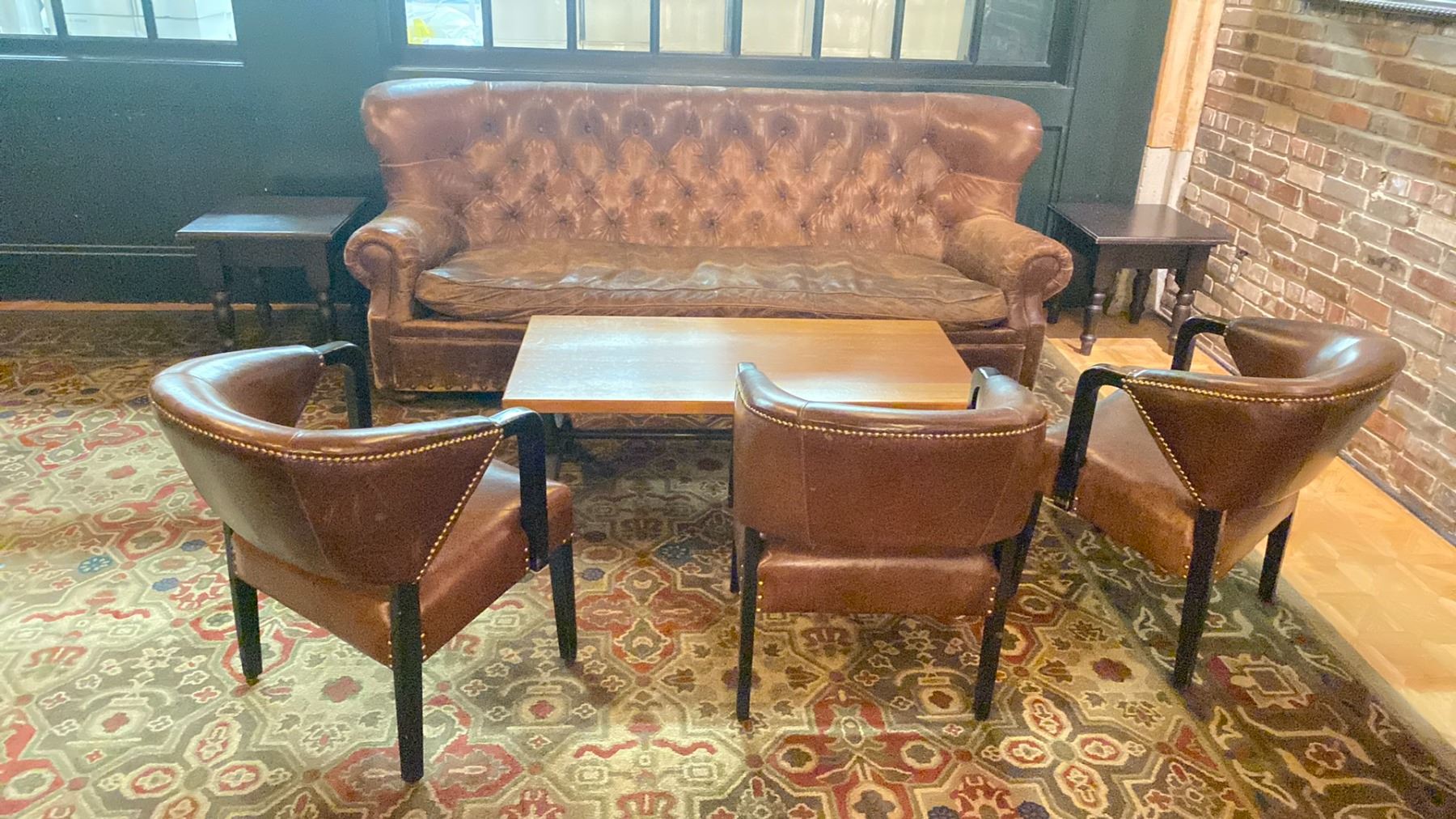 BROWN LEATHER STUDDED BACK 3 SEAT COUCH, 3 DARK WOOD BROWN LEATHER STUDDED ARM CHAIRS, METAL BASE