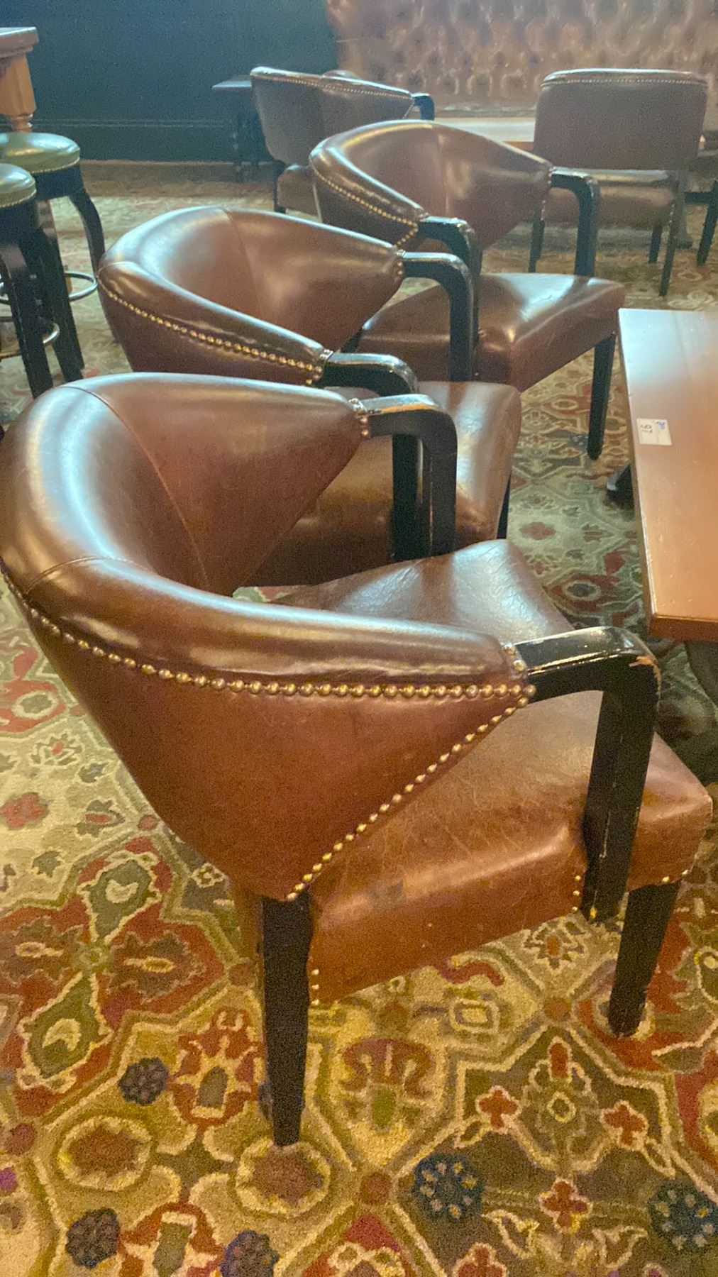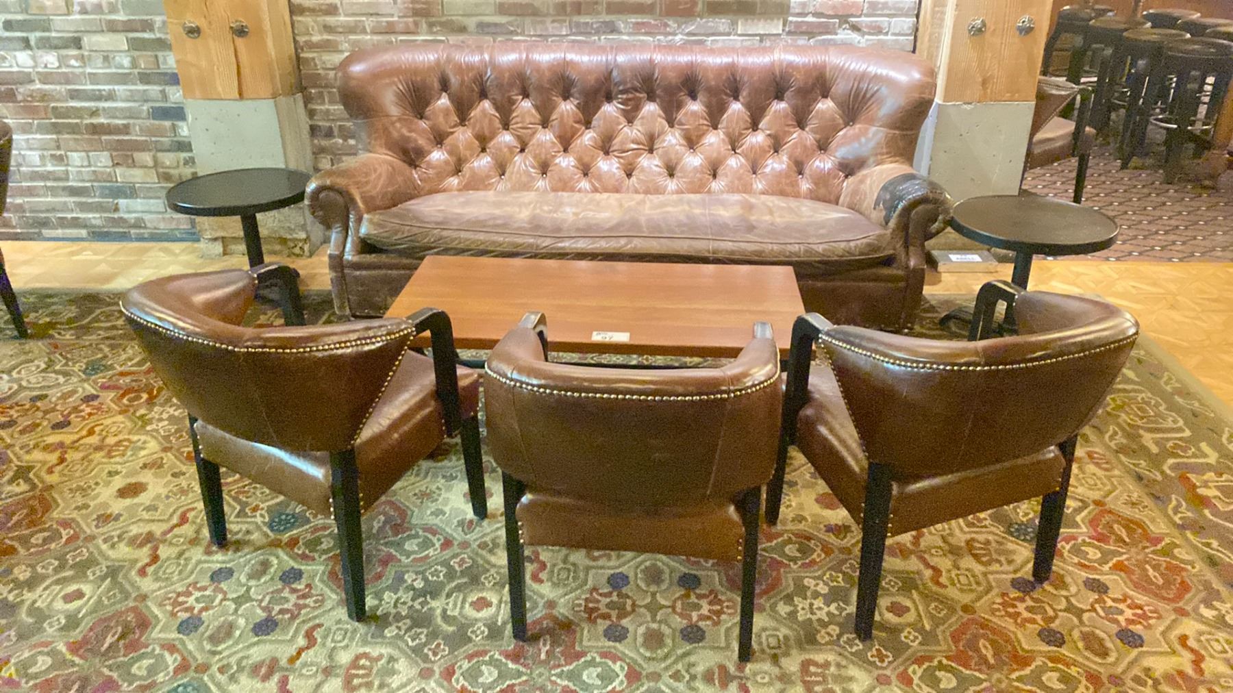 BROWN LEATHER STUDDED BACK 3 SEAT COUCH, 3 DARK WOOD BROWN LEATHER STUDDED ARM CHAIRS, METAL BASE WOOD TOP COFFEE TABLE & 2 DARK WOOD END TABLES