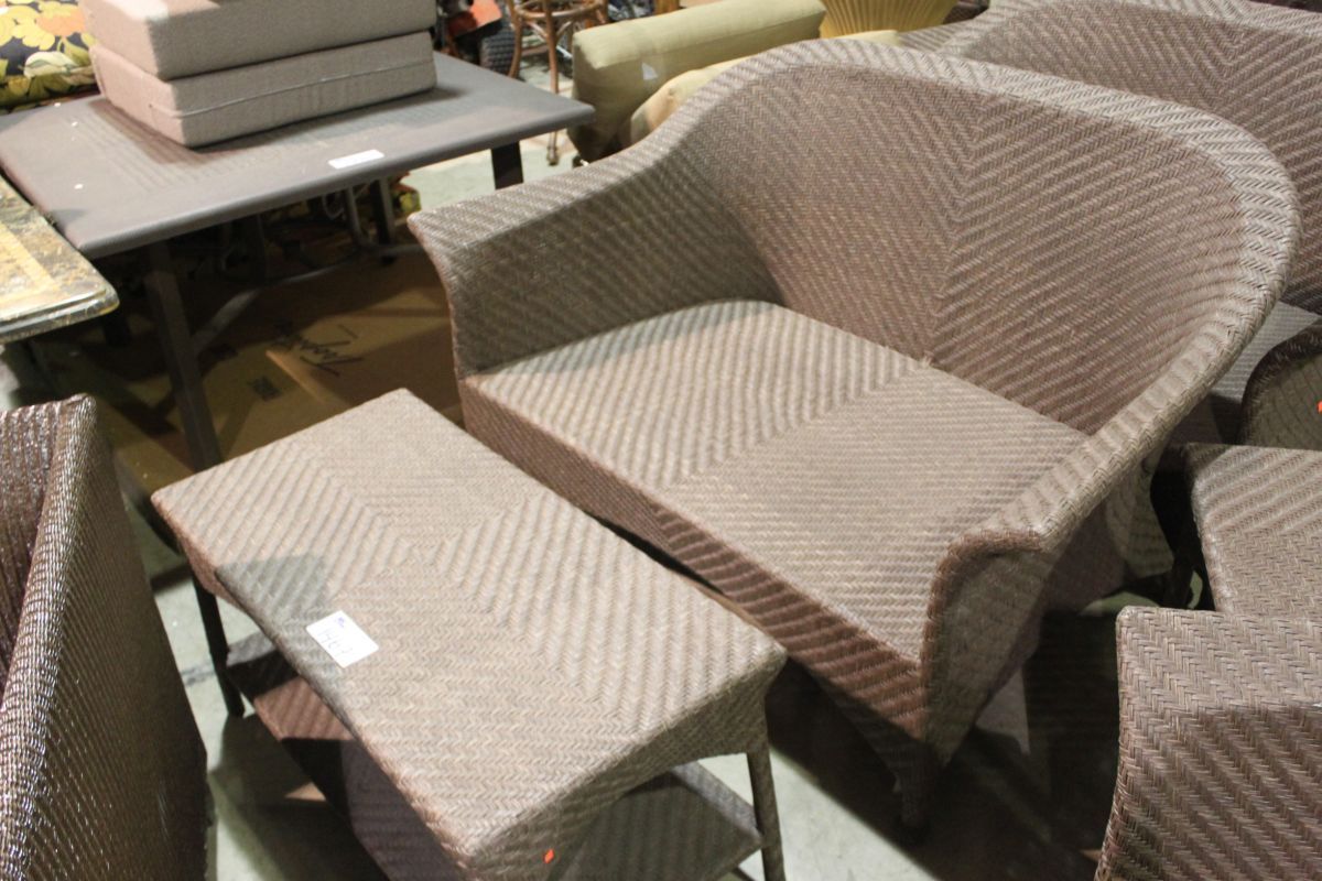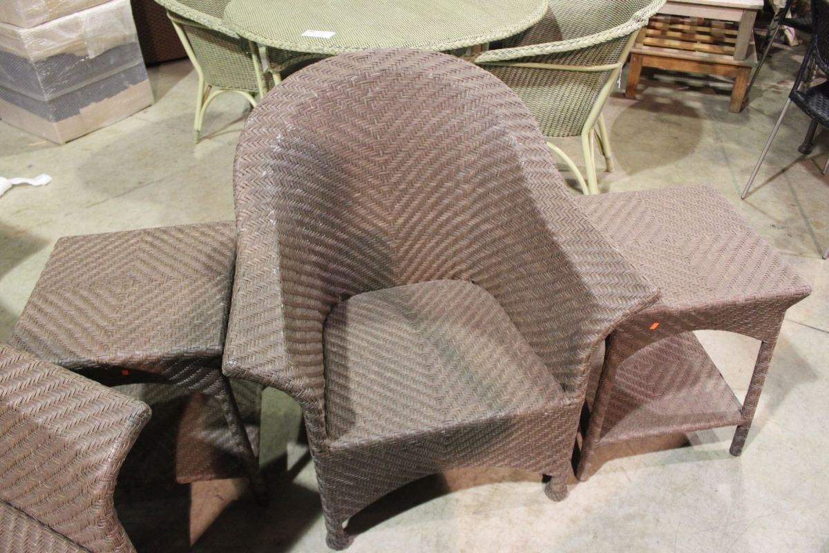 BROWN RATTAN CURVED BACK LOVE SEAT, CHAIR, COFFEE TABLE & 2 END TABLES