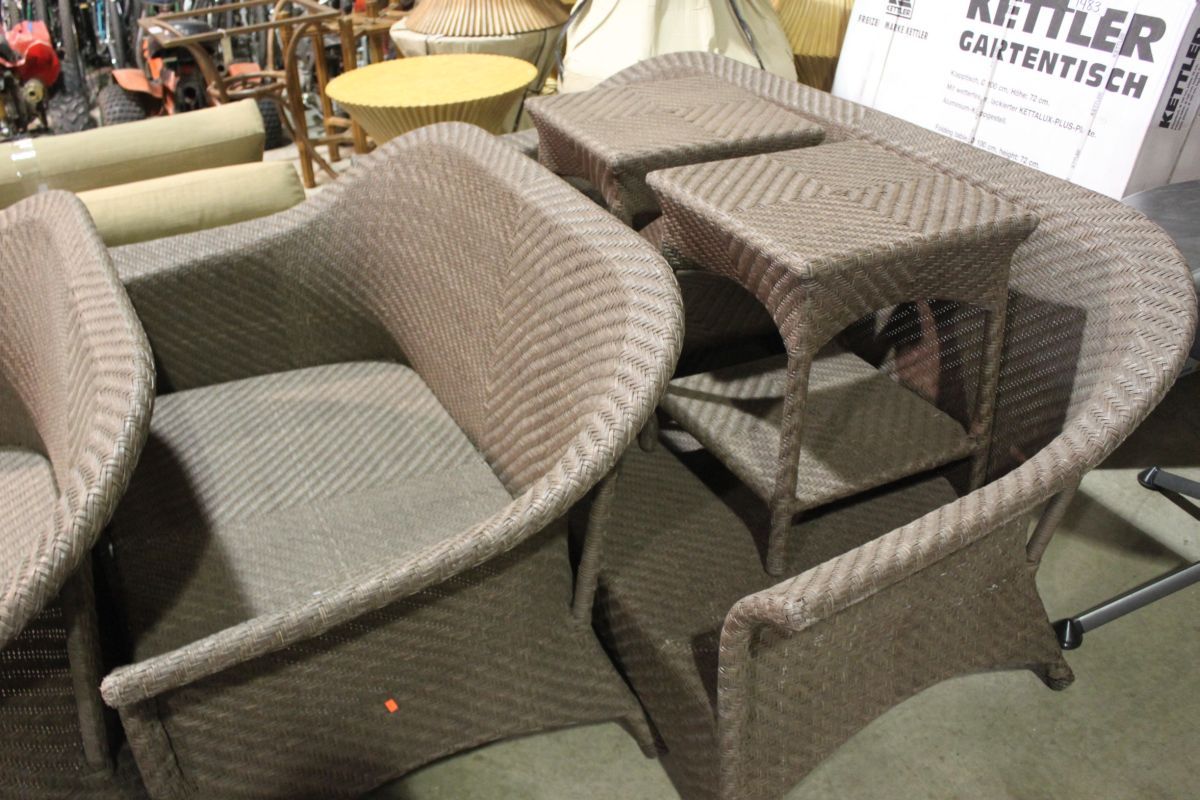 BROWN RATTAN CURVED BACK LOVE SEAT, SOFA & 2 END TABLES