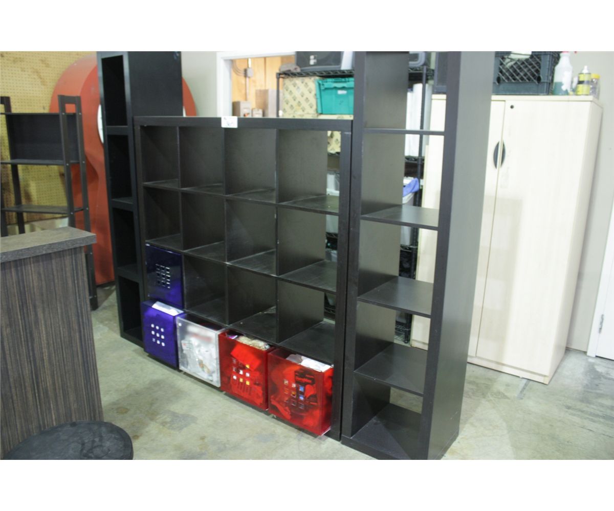 BROWN SALON SHELVING SYSTEM AND CONTENTS
