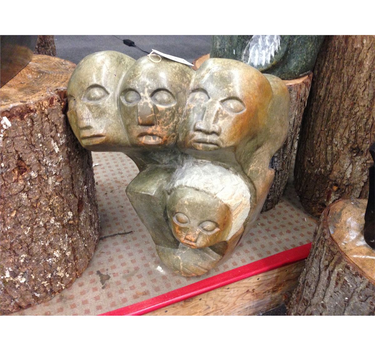 BROWN SERPENTINE, HAND CARVED ABSTRACT 4 HEADS, 20" TALL 18"WIDE