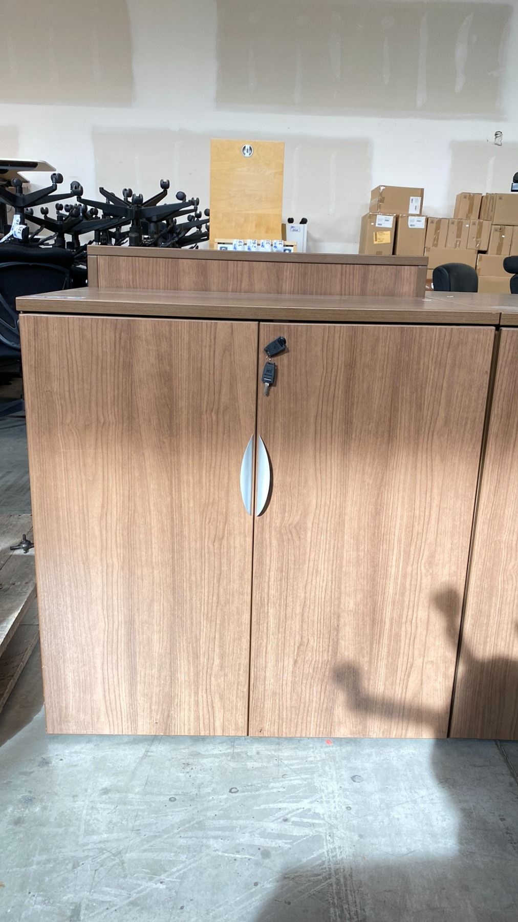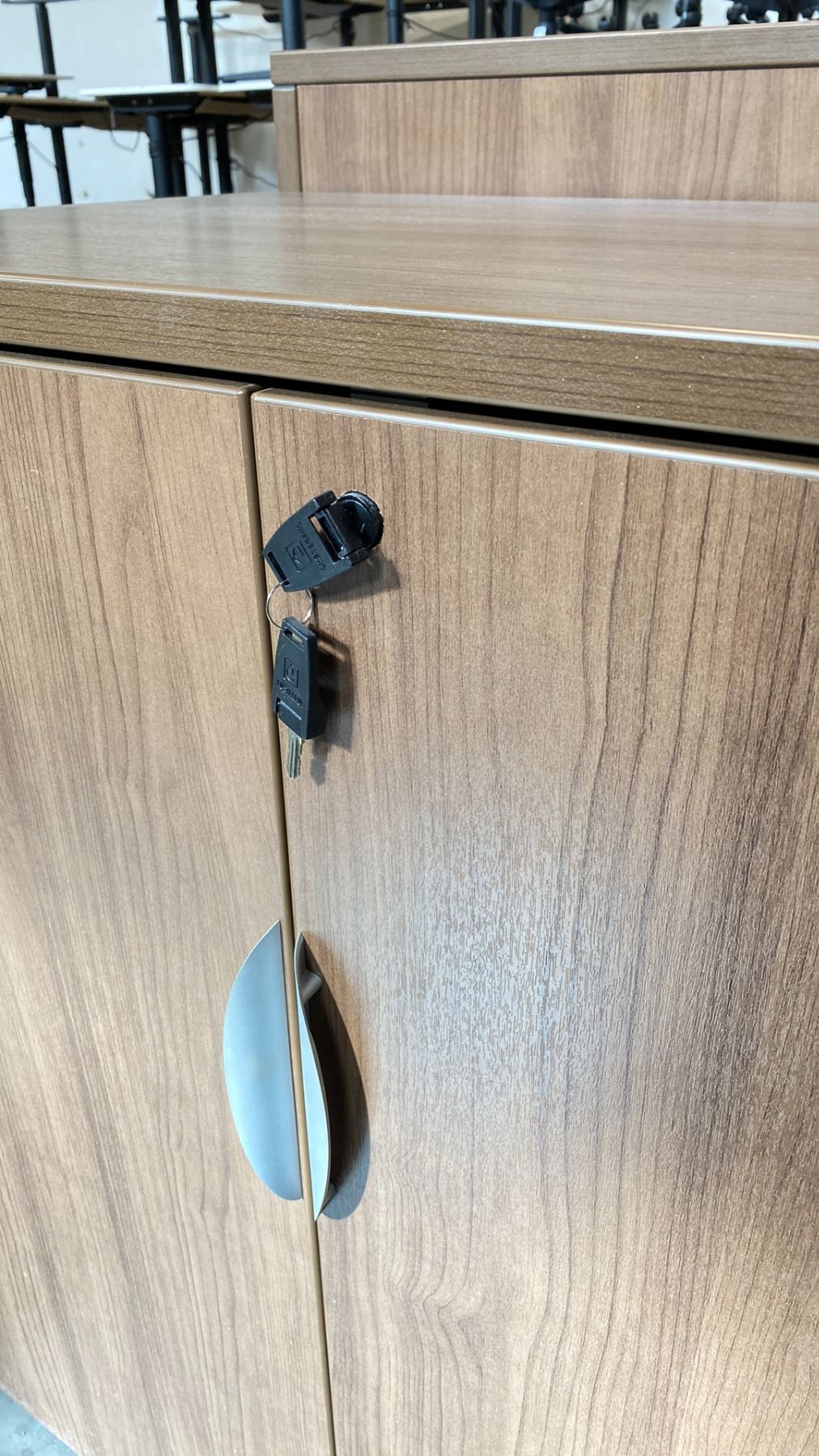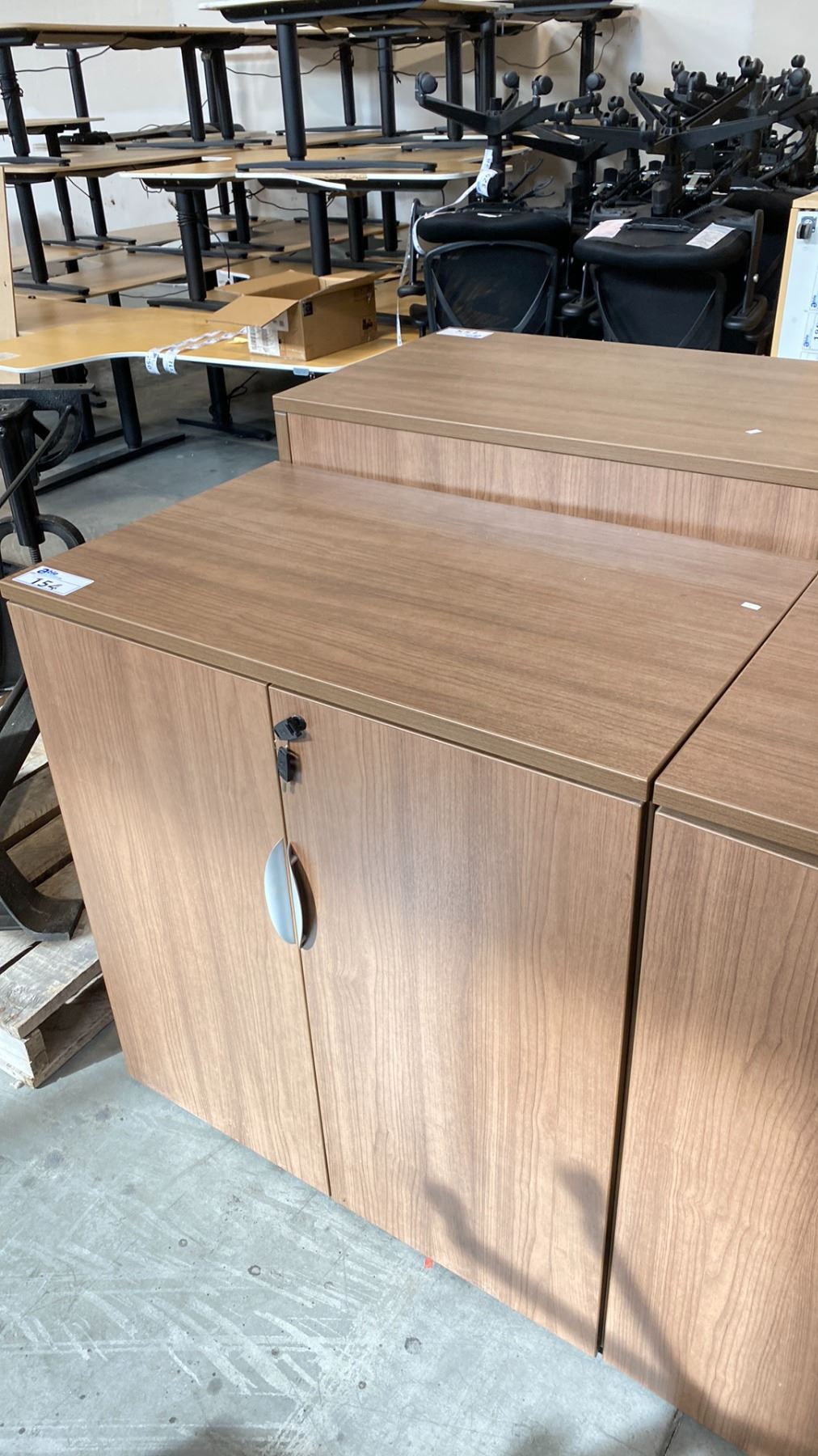 BROWN WOOD PATTERN 2 DOOR FLOOR CABINET WITH BUILT IN LOCK, COMES WITH KEYS (35.5"W 22"D 37.5"H)