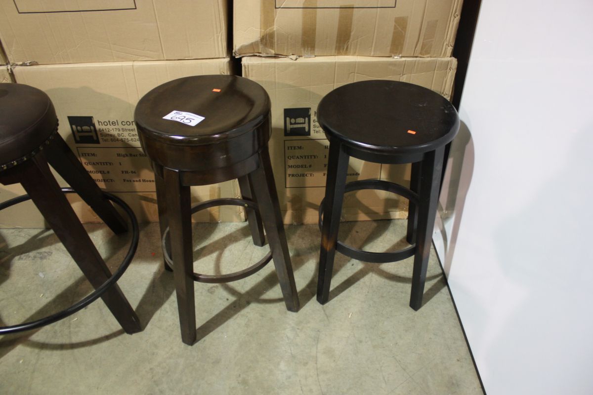 BROWN WOODEN SWIVEL BAR STOOL & A BLACK BAR STOOL