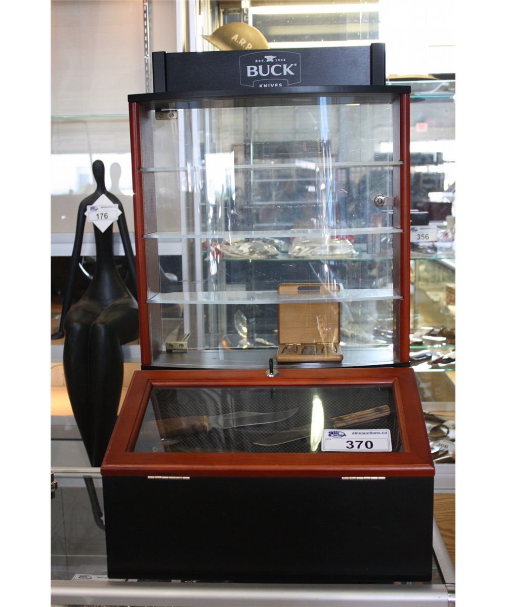BUCK KNIVES SHOW CASE WITH LOT OF BUCK KNIVES AND KEY