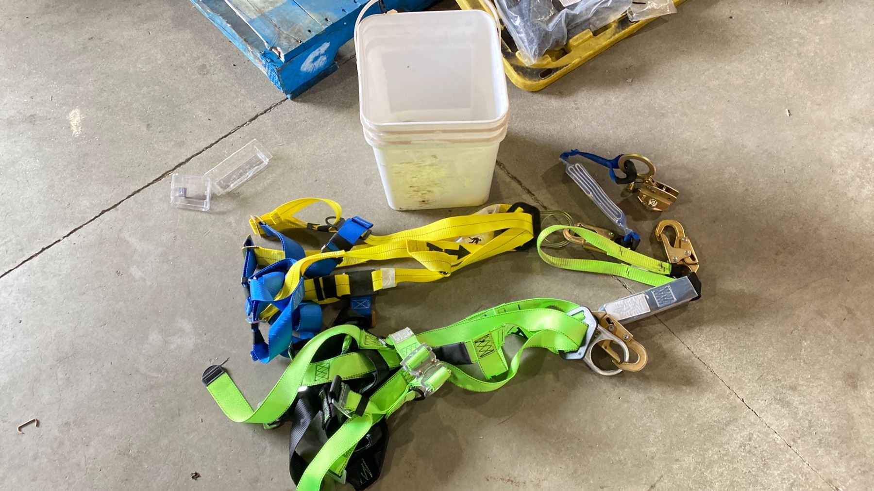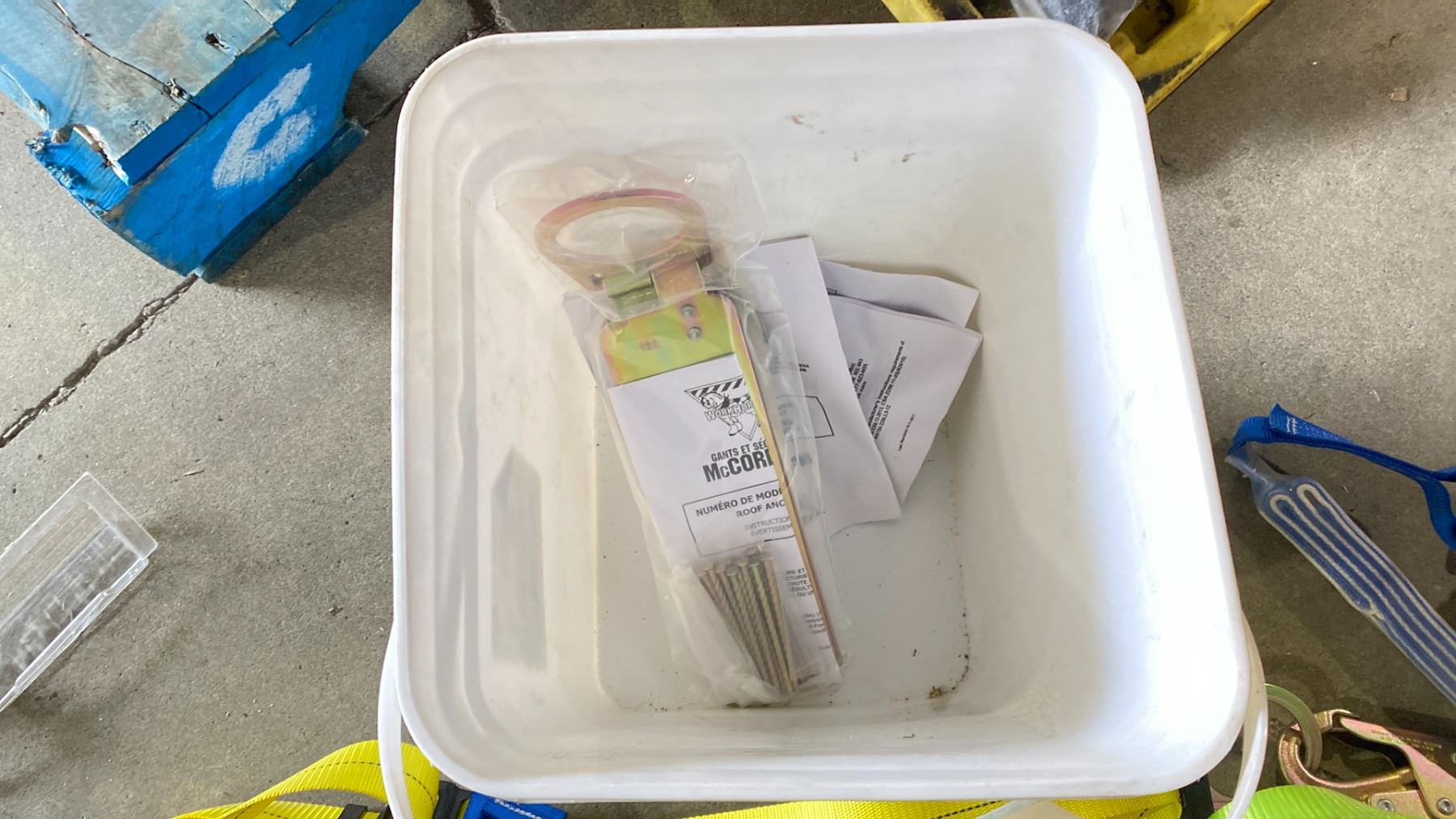 BUCKET WITH TWO SAFETY HARNESSES, SHOCK ABSORBING LANYARDS, 1 REUSABLE ROOF ANCHOR