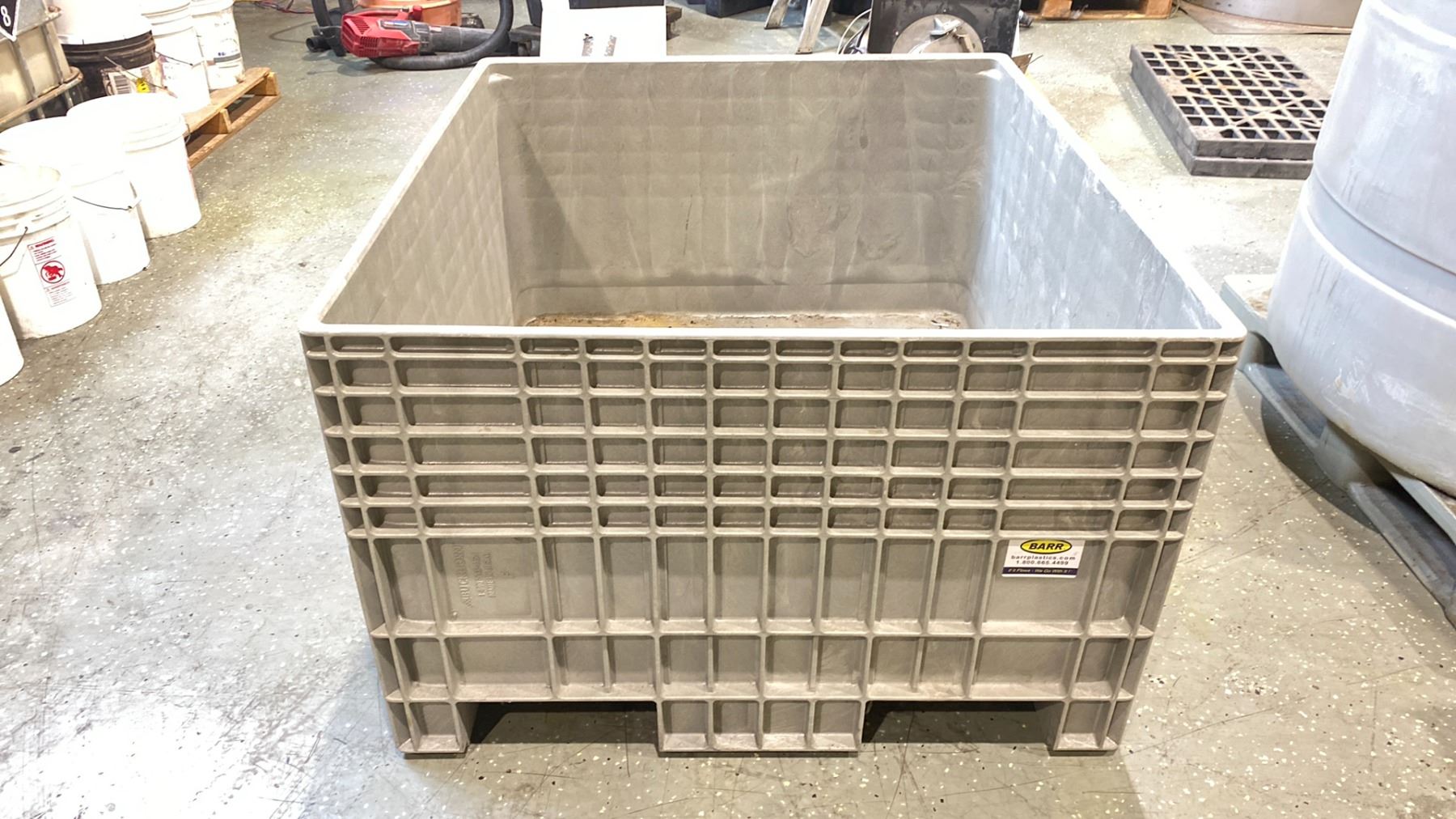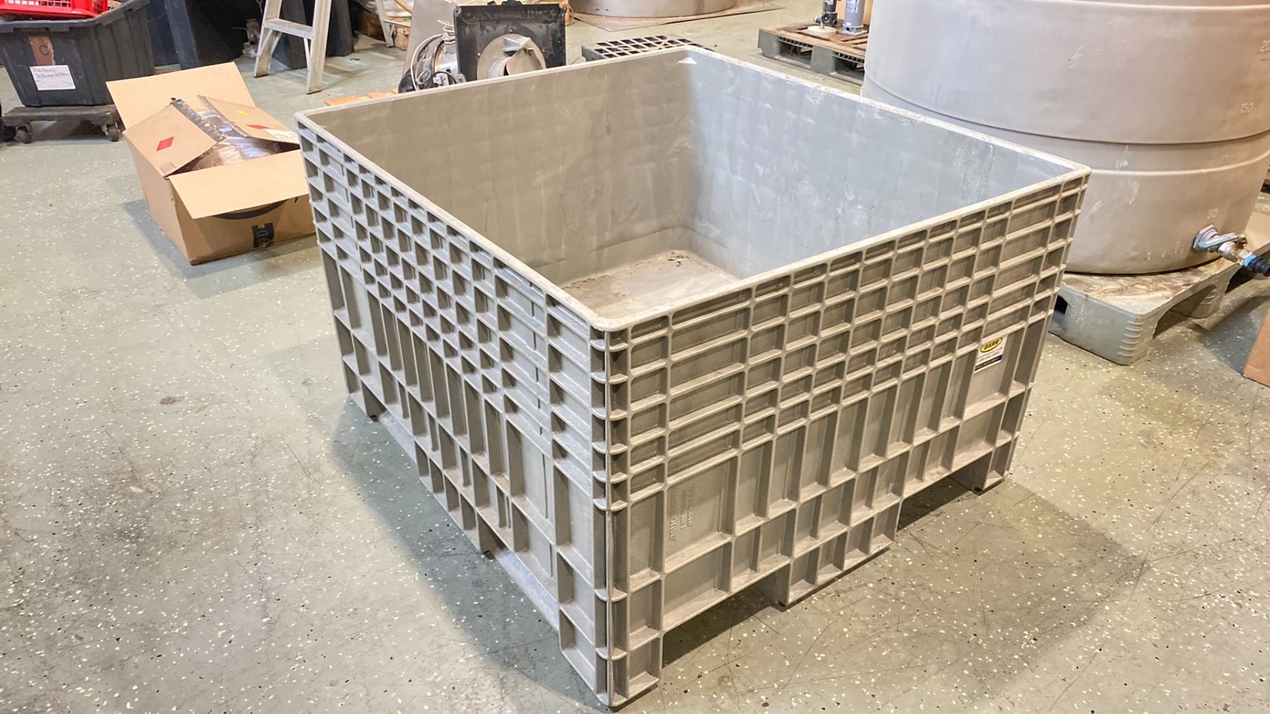 BUCKHORN MADE IN USA GREY INDUSTRIAL HARD PLASTIC PALLET BIN 4' X 44" X 24" INTERNAL 29 1/2" EXTERNAL