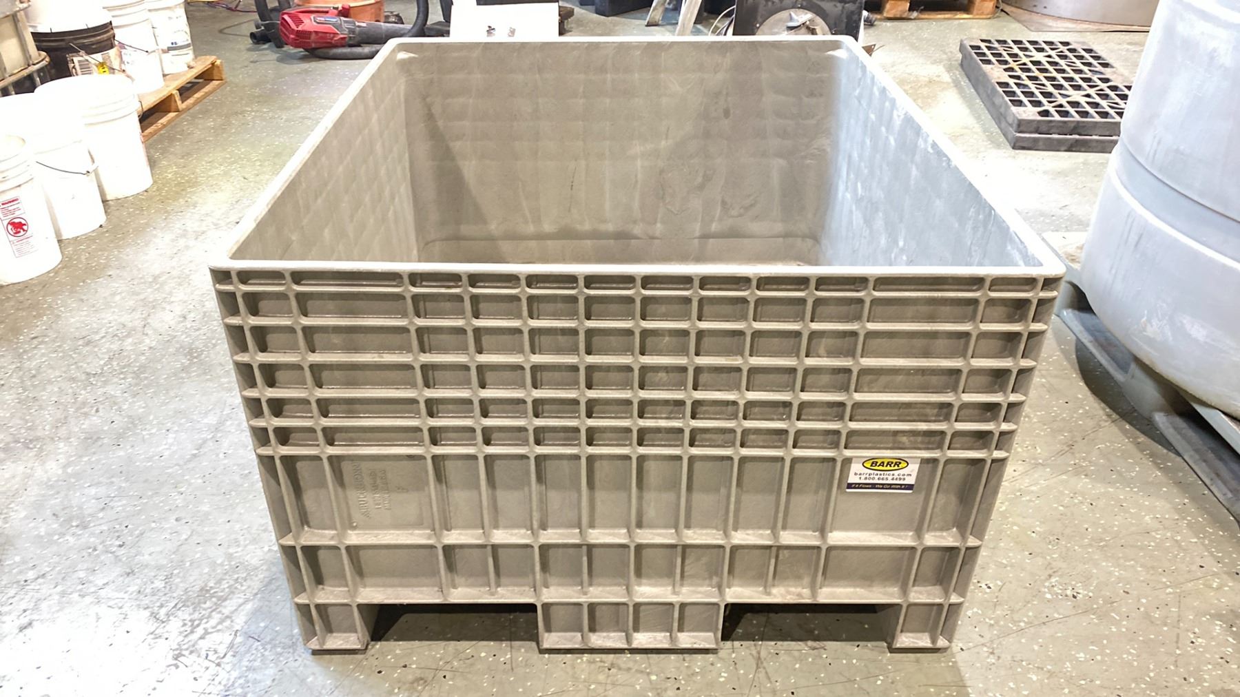 BUCKHORN MADE IN USA GREY INDUSTRIAL HARD PLASTIC PALLET BIN 4' X 44" X 24" INTERNAL 29 1/2"