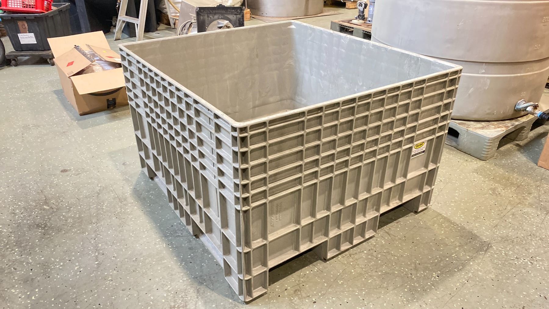 BUCKHORN MADE IN USA GREY INDUSTRIAL HARD PLASTIC PALLET BIN 4' X 44" X 24" INTERNAL 29 1/2" EXTERNAL